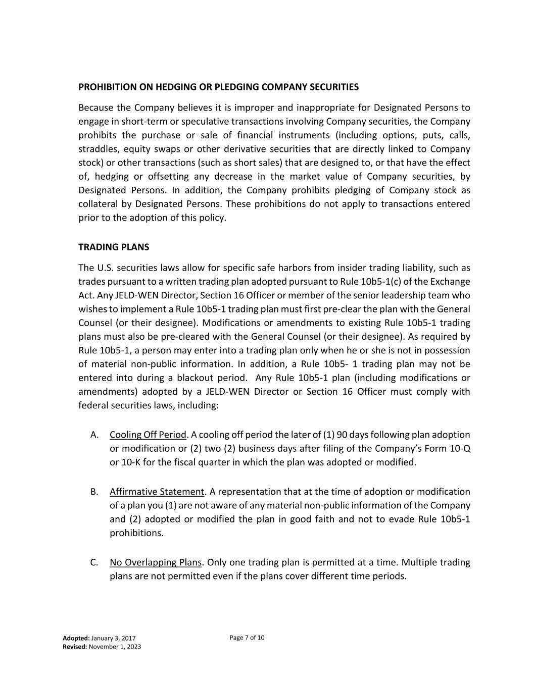 Adopted: January 3, 2017 Revised: November 1, 2023 Page 7 of 10 PROHIBITION ON HEDGING OR PLEDGING COMPANY SECURITIES Because the Company believes it is improper and inappropriate for Designated Persons to engage in short-term or speculative transactions involving Company securities, the Company prohibits the purchase or sale of financial instruments (including options, puts, calls, straddles, equity swaps or other derivative securities that are directly linked to Company stock) or other transactions (such as short sales) that are designed to, or that have the effect of, hedging or offsetting any decrease in the market value of Company securities, by Designated Persons. In addition, the Company prohibits pledging of Company stock as collateral by Designated Persons. These prohibitions do not apply to transactions entered prior to the adoption of this policy. TRADING PLANS The U.S. securities laws allow for specific safe harbors from insider trading liability, such as trades pursuant to a written trading plan adopted pursuant to Rule 10b5-1(c) of the Exchange Act. Any JELD-WEN Director, Section 16 Officer or member of the senior leadership team who wishes to implement a Rule 10b5-1 trading plan must first pre-clear the plan with the General Counsel (or their designee). Modifications or amendments to existing Rule 10b5-1 trading plans must also be pre-cleared with the General Counsel (or their designee). As required by Rule 10b5-1, a person may enter into a trading plan only when he or she is not in possession of material non-public information. In addition, a Rule 10b5- 1 trading plan may not be entered into during a blackout period. Any Rule 10b5-1 plan (including modifications or amendments) adopted by a JELD-WEN Director or Section 16 Officer must comply with federal securities laws, including: A. Cooling Off Period. A cooling off period the later of (1) 90 days following plan adoption or modification or (2) two (2) business days after filing of the Company’s Form 10-Q or 10-K for the fiscal quarter in which the plan was adopted or modified. B. Affirmative Statement. A representation that at the time of adoption or modification of a plan you (1) are not aware of any material non-public information of the Company and (2) adopted or modified the plan in good faith and not to evade Rule 10b5-1 prohibitions. C. No Overlapping Plans. Only one trading plan is permitted at a time. Multiple trading plans are not permitted even if the plans cover different time periods.