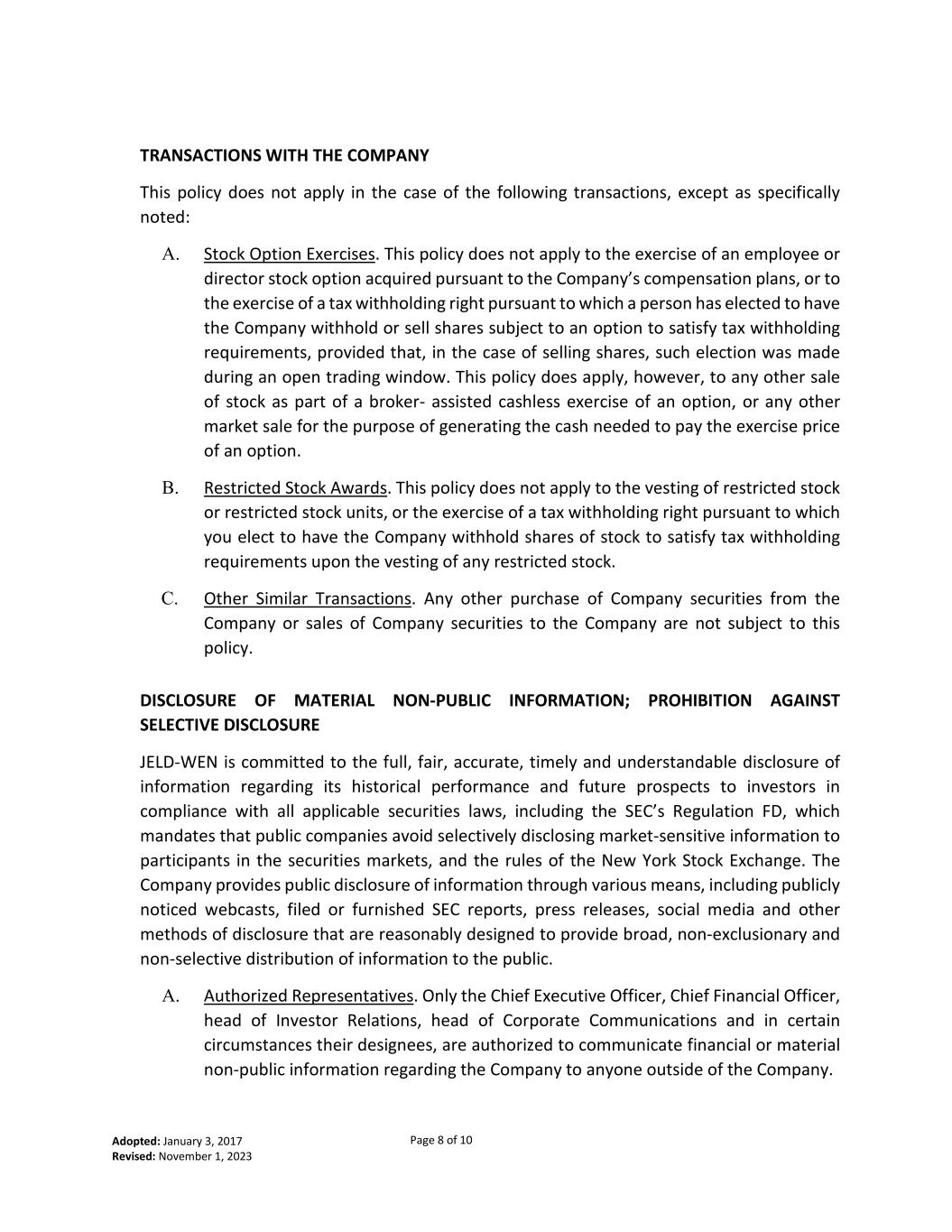 Adopted: January 3, 2017 Revised: November 1, 2023 Page 8 of 10 TRANSACTIONS WITH THE COMPANY This policy does not apply in the case of the following transactions, except as specifically noted: A. Stock Option Exercises. This policy does not apply to the exercise of an employee or director stock option acquired pursuant to the Company’s compensation plans, or to the exercise of a tax withholding right pursuant to which a person has elected to have the Company withhold or sell shares subject to an option to satisfy tax withholding requirements, provided that, in the case of selling shares, such election was made during an open trading window. This policy does apply, however, to any other sale of stock as part of a broker- assisted cashless exercise of an option, or any other market sale for the purpose of generating the cash needed to pay the exercise price of an option. B. Restricted Stock Awards. This policy does not apply to the vesting of restricted stock or restricted stock units, or the exercise of a tax withholding right pursuant to which you elect to have the Company withhold shares of stock to satisfy tax withholding requirements upon the vesting of any restricted stock. C. Other Similar Transactions. Any other purchase of Company securities from the Company or sales of Company securities to the Company are not subject to this policy. DISCLOSURE OF MATERIAL NON-PUBLIC INFORMATION; PROHIBITION AGAINST SELECTIVE DISCLOSURE JELD-WEN is committed to the full, fair, accurate, timely and understandable disclosure of information regarding its historical performance and future prospects to investors in compliance with all applicable securities laws, including the SEC’s Regulation FD, which mandates that public companies avoid selectively disclosing market-sensitive information to participants in the securities markets, and the rules of the New York Stock Exchange. The Company provides public disclosure of information through various means, including publicly noticed webcasts, filed or furnished SEC reports, press releases, social media and other methods of disclosure that are reasonably designed to provide broad, non-exclusionary and non-selective distribution of information to the public. A. Authorized Representatives. Only the Chief Executive Officer, Chief Financial Officer, head of Investor Relations, head of Corporate Communications and in certain circumstances their designees, are authorized to communicate financial or material non-public information regarding the Company to anyone outside of the Company.