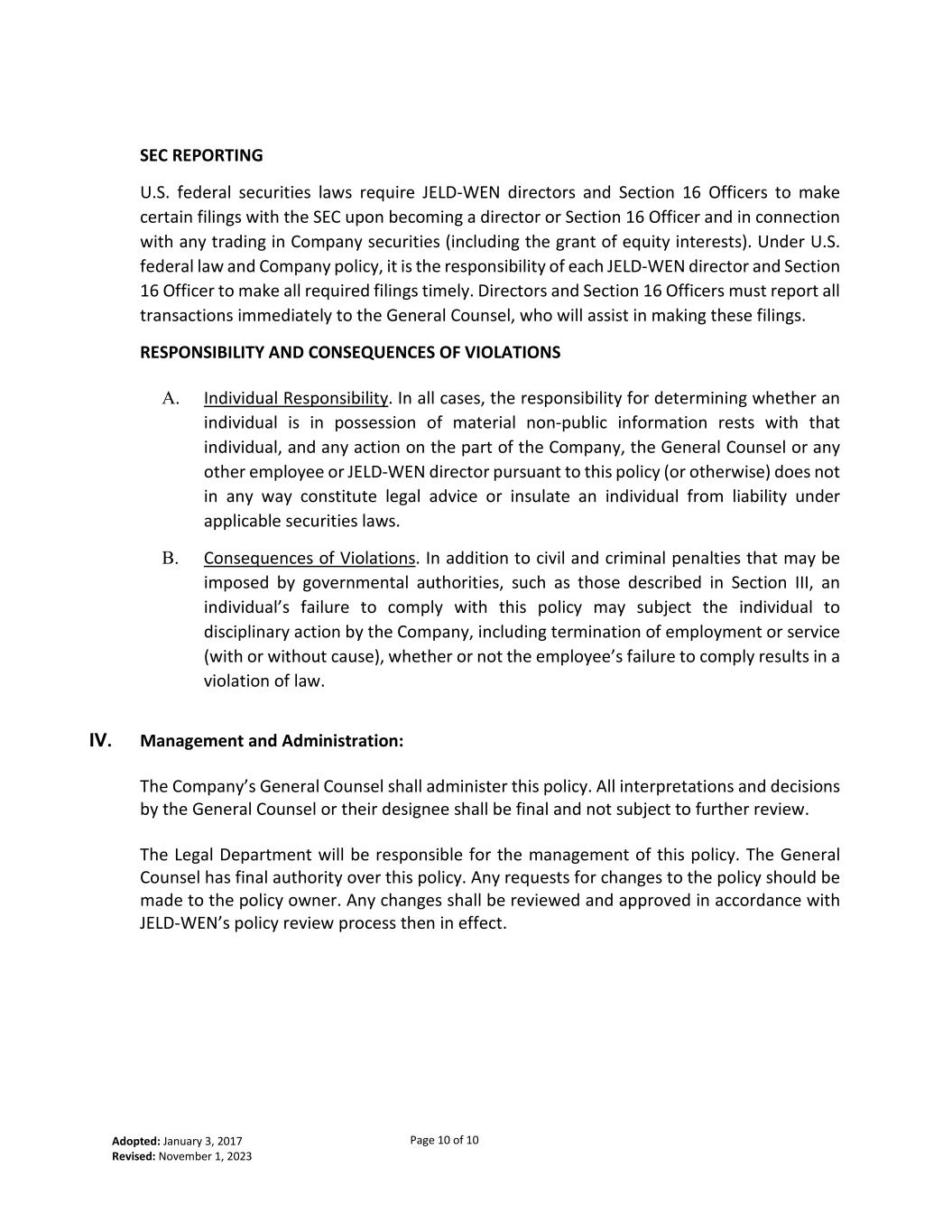 Adopted: January 3, 2017 Revised: November 1, 2023 Page 10 of 10 SEC REPORTING U.S. federal securities laws require JELD-WEN directors and Section 16 Officers to make certain filings with the SEC upon becoming a director or Section 16 Officer and in connection with any trading in Company securities (including the grant of equity interests). Under U.S. federal law and Company policy, it is the responsibility of each JELD-WEN director and Section 16 Officer to make all required filings timely. Directors and Section 16 Officers must report all transactions immediately to the General Counsel, who will assist in making these filings. RESPONSIBILITY AND CONSEQUENCES OF VIOLATIONS A. Individual Responsibility. In all cases, the responsibility for determining whether an individual is in possession of material non-public information rests with that individual, and any action on the part of the Company, the General Counsel or any other employee or JELD-WEN director pursuant to this policy (or otherwise) does not in any way constitute legal advice or insulate an individual from liability under applicable securities laws. B. Consequences of Violations. In addition to civil and criminal penalties that may be imposed by governmental authorities, such as those described in Section III, an individual’s failure to comply with this policy may subject the individual to disciplinary action by the Company, including termination of employment or service (with or without cause), whether or not the employee’s failure to comply results in a violation of law. IV. Management and Administration: The Company’s General Counsel shall administer this policy. All interpretations and decisions by the General Counsel or their designee shall be final and not subject to further review. The Legal Department will be responsible for the management of this policy. The General Counsel has final authority over this policy. Any requests for changes to the policy should be made to the policy owner. Any changes shall be reviewed and approved in accordance with JELD-WEN’s policy review process then in effect.