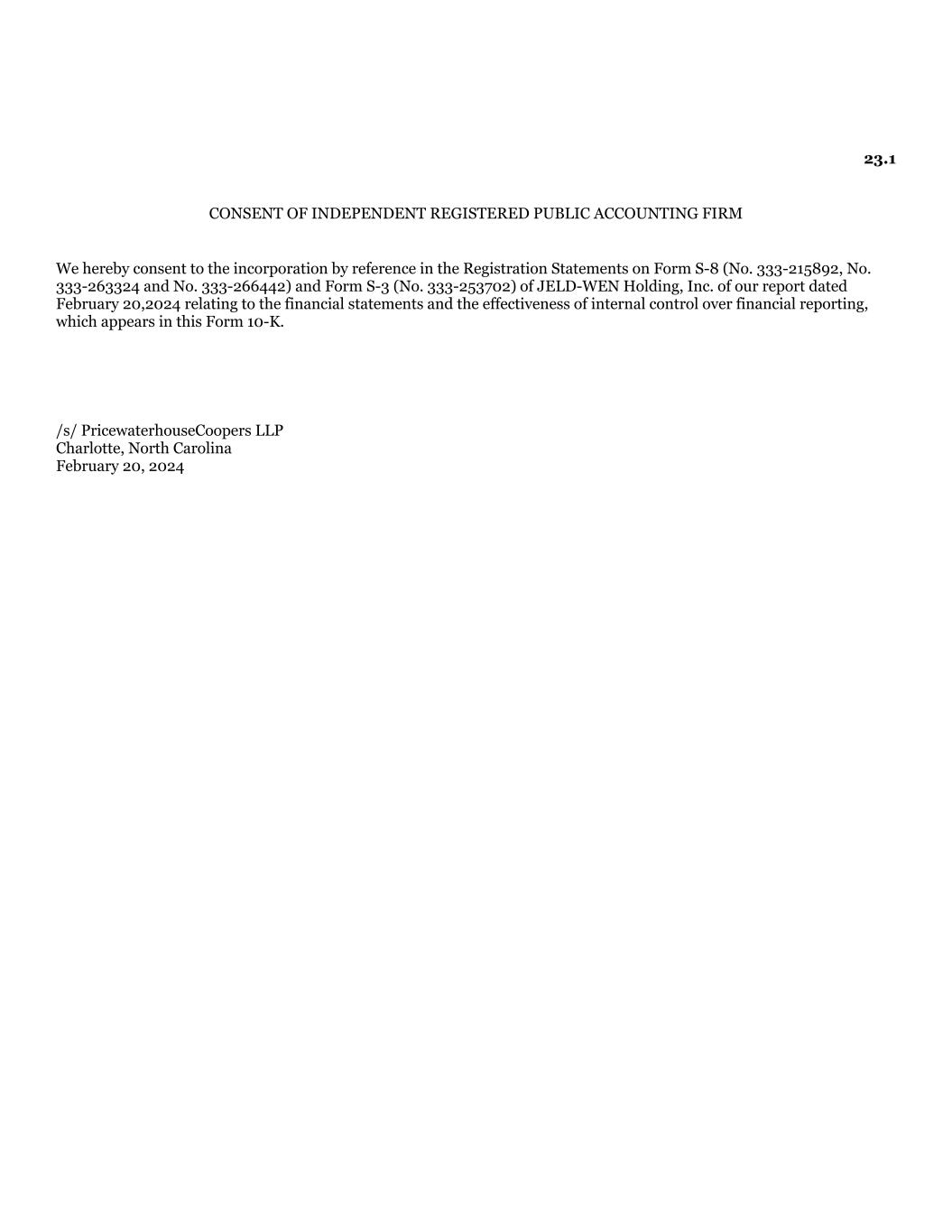 23.1 CONSENT OF INDEPENDENT REGISTERED PUBLIC ACCOUNTING FIRM We hereby consent to the incorporation by reference in the Registration Statements on Form S-8 (No. 333-215892, No. 333-263324 and No. 333-266442) and Form S-3 (No. 333-253702) of JELD-WEN Holding, Inc. of our report dated February 20,2024 relating to the financial statements and the effectiveness of internal control over financial reporting, which appears in this Form 10-K. /s/ PricewaterhouseCoopers LLP Charlotte, North Carolina February 20, 2024