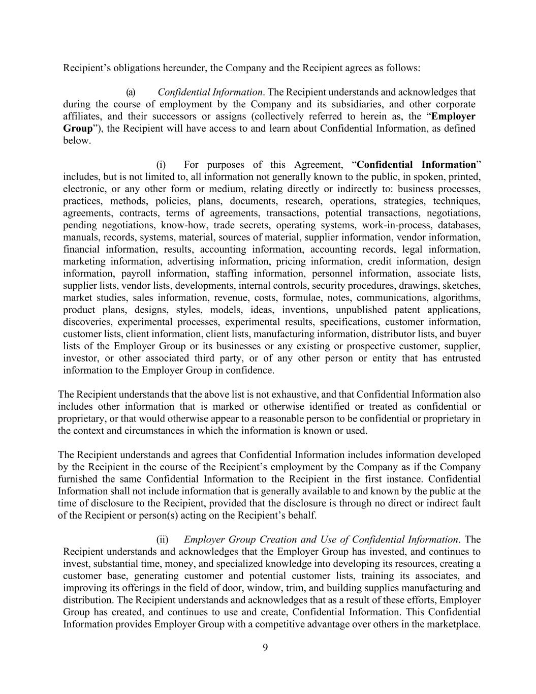 9 Recipient’s obligations hereunder, the Company and the Recipient agrees as follows: (a) Confidential Information. The Recipient understands and acknowledges that during the course of employment by the Company and its subsidiaries, and other corporate affiliates, and their successors or assigns (collectively referred to herein as, the “Employer Group”), the Recipient will have access to and learn about Confidential Information, as defined below. (i) For purposes of this Agreement, “Confidential Information” includes, but is not limited to, all information not generally known to the public, in spoken, printed, electronic, or any other form or medium, relating directly or indirectly to: business processes, practices, methods, policies, plans, documents, research, operations, strategies, techniques, agreements, contracts, terms of agreements, transactions, potential transactions, negotiations, pending negotiations, know-how, trade secrets, operating systems, work-in-process, databases, manuals, records, systems, material, sources of material, supplier information, vendor information, financial information, results, accounting information, accounting records, legal information, marketing information, advertising information, pricing information, credit information, design information, payroll information, staffing information, personnel information, associate lists, supplier lists, vendor lists, developments, internal controls, security procedures, drawings, sketches, market studies, sales information, revenue, costs, formulae, notes, communications, algorithms, product plans, designs, styles, models, ideas, inventions, unpublished patent applications, discoveries, experimental processes, experimental results, specifications, customer information, customer lists, client information, client lists, manufacturing information, distributor lists, and buyer lists of the Employer Group or its businesses or any existing or prospective customer, supplier, investor, or other associated third party, or of any other person or entity that has entrusted information to the Employer Group in confidence. The Recipient understands that the above list is not exhaustive, and that Confidential Information also includes other information that is marked or otherwise identified or treated as confidential or proprietary, or that would otherwise appear to a reasonable person to be confidential or proprietary in the context and circumstances in which the information is known or used. The Recipient understands and agrees that Confidential Information includes information developed by the Recipient in the course of the Recipient’s employment by the Company as if the Company furnished the same Confidential Information to the Recipient in the first instance. Confidential Information shall not include information that is generally available to and known by the public at the time of disclosure to the Recipient, provided that the disclosure is through no direct or indirect fault of the Recipient or person(s) acting on the Recipient’s behalf. (ii) Employer Group Creation and Use of Confidential Information. The Recipient understands and acknowledges that the Employer Group has invested, and continues to invest, substantial time, money, and specialized knowledge into developing its resources, creating a customer base, generating customer and potential customer lists, training its associates, and improving its offerings in the field of door, window, trim, and building supplies manufacturing and distribution. The Recipient understands and acknowledges that as a result of these efforts, Employer Group has created, and continues to use and create, Confidential Information. This Confidential Information provides Employer Group with a competitive advantage over others in the marketplace.