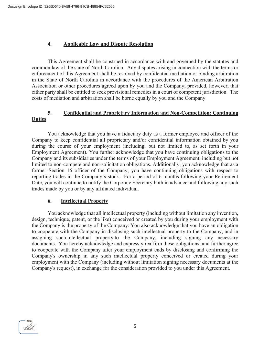 5 4. Applicable Law and Dispute Resolution This Agreement shall be construed in accordance with and governed by the statutes and common law of the state of North Carolina. Any disputes arising in connection with the terms or enforcement of this Agreement shall be resolved by confidential mediation or binding arbitration in the State of North Carolina in accordance with the procedures of the American Arbitration Association or other procedures agreed upon by you and the Company; provided, however, that either party shall be entitled to seek provisional remedies in a court of competent jurisdiction. The costs of mediation and arbitration shall be borne equally by you and the Company. 5. Confidential and Proprietary Information and Non-Competition; Continuing Duties You acknowledge that you have a fiduciary duty as a former employee and officer of the Company to keep confidential all proprietary and/or confidential information obtained by you during the course of your employment (including, but not limited to, as set forth in your Employment Agreement). You further acknowledge that you have continuing obligations to the Company and its subsidiaries under the terms of your Employment Agreement, including but not limited to non-compete and non-solicitation obligations. Additionally, you acknowledge that as a former Section 16 officer of the Company, you have continuing obligations with respect to reporting trades in the Company’s stock. For a period of 6 months following your Retirement Date, you will continue to notify the Corporate Secretary both in advance and following any such trades made by you or by any affiliated individual. 6. Intellectual Property You acknowledge that all intellectual property (including without limitation any invention, design, technique, patent, or the like) conceived or created by you during your employment with the Company is the property of the Company. You also acknowledge that you have an obligation to cooperate with the Company in disclosing such intellectual property to the Company, and in assigning such intellectual property to the Company, including signing any necessary documents. You hereby acknowledge and expressly reaffirm these obligations, and further agree to cooperate with the Company after your employment ends by disclosing and confirming the Company's ownership in any such intellectual property conceived or created during your employment with the Company (including without limitation signing necessary documents at the Company's request), in exchange for the consideration provided to you under this Agreement.