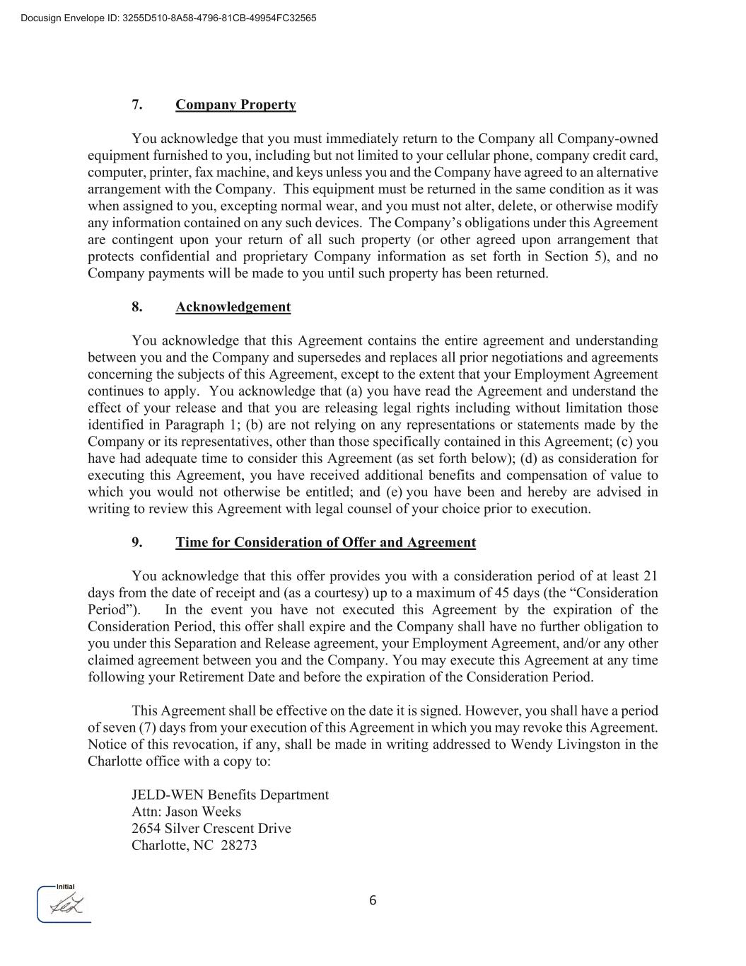 6 7. Company Property You acknowledge that you must immediately return to the Company all Company-owned equipment furnished to you, including but not limited to your cellular phone, company credit card, computer, printer, fax machine, and keys unless you and the Company have agreed to an alternative arrangement with the Company. This equipment must be returned in the same condition as it was when assigned to you, excepting normal wear, and you must not alter, delete, or otherwise modify any information contained on any such devices. The Company’s obligations under this Agreement are contingent upon your return of all such property (or other agreed upon arrangement that protects confidential and proprietary Company information as set forth in Section 5), and no Company payments will be made to you until such property has been returned. 8. Acknowledgement You acknowledge that this Agreement contains the entire agreement and understanding between you and the Company and supersedes and replaces all prior negotiations and agreements concerning the subjects of this Agreement, except to the extent that your Employment Agreement continues to apply. You acknowledge that (a) you have read the Agreement and understand the effect of your release and that you are releasing legal rights including without limitation those identified in Paragraph 1; (b) are not relying on any representations or statements made by the Company or its representatives, other than those specifically contained in this Agreement; (c) you have had adequate time to consider this Agreement (as set forth below); (d) as consideration for executing this Agreement, you have received additional benefits and compensation of value to which you would not otherwise be entitled; and (e) you have been and hereby are advised in writing to review this Agreement with legal counsel of your choice prior to execution. 9. Time for Consideration of Offer and Agreement You acknowledge that this offer provides you with a consideration period of at least 21 days from the date of receipt and (as a courtesy) up to a maximum of 45 days (the “Consideration Period”). In the event you have not executed this Agreement by the expiration of the Consideration Period, this offer shall expire and the Company shall have no further obligation to you under this Separation and Release agreement, your Employment Agreement, and/or any other claimed agreement between you and the Company. You may execute this Agreement at any time following your Retirement Date and before the expiration of the Consideration Period. This Agreement shall be effective on the date it is signed. However, you shall have a period of seven (7) days from your execution of this Agreement in which you may revoke this Agreement. Notice of this revocation, if any, shall be made in writing addressed to Wendy Livingston in the Charlotte office with a copy to: JELD-WEN Benefits Department Attn: Jason Weeks 2654 Silver Crescent Drive Charlotte, NC 28273