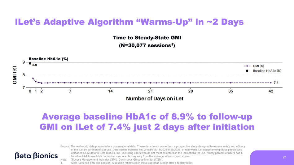 24 Meaningful change regardless of baseline HbA1c, with >85% of users meeting ADA hypoglycemia goals on iLet Source: The real - world data presented is observational data. These data do not come from a prospective study designed to evaluate the effect of the iLet Bionic Pancreas’ safety and efficacy versus multiple daily injections or competitive hybrid - closed loop systems. Real - world data comes from the first two years (5/19/2023 – 5/18/2025) of iLet usage among iLet users with baseline HbA1c data and pre - iLet therapy data of MDI, and who uploaded data to Beta Bionics, Inc., including users who do not meet all criteria in the Indications for use. Individual user results may vary from the average values shown here. Note: Glucose Management Indicator (GMI). Multiple Daily Injections (MDI). American Diabetes Association (ADA). iLet Users Coming from MDI 9.2 7.3 Baseline HbA1c iLet GMI - 1.9 Baseline HbA1c to Follow - Up GMI Baseline HbA1c Average Baseline HbA1c Average Change Average GMI on the iLet 8.0% 9.2% >9% (N=4,014) 11.0% 7 - 9% (N=3,881) Overall (N=8,802) <7% (N=907) 6.4% 7.6% 7.3% 7.2% 7.0% - 3.5% - 1.9% - 0.8% +0.6% N=8,802