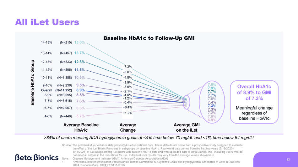 4% 19% 12% 6% 4% 2% 2% 1% <6% 6 - 7% 7 - 8% 8 - 9% 11 - 12% 12 - 13% 13 - 14% >14% 3% 16% 26% 21% 20% 14% 8% 5% 3% 3% 1% T1D Adults HbA1c in the US 1 vs. iLet T1D Adults Baseline HbA1c 30% 9 - 10% 10 - 11% HbA1c Group (%) iLet Is a Population Health Tool (1/2) 21 % T1D Adults in the US (Pettus et al., N=31,430) % T1D Adults iLet Users (Pre - iLet, N=10,333) Source: The real - world data presented is observational data. These data do not come from a prospective study designed to evaluate the baseline HbA1c of iLet adult users with T1D relative to the population of adults in the U.S. with T1D. Real - world data comes from the first two years (5/19/2023 – 5/18/2025) of iLet usage among 10,333 adult iLet users with T1D with baseline HbA1c data, and who uploaded data to Beta Bionics, Inc. Individual user results may vary from the average values shown here. Note: Type 1 Diabetes (T1D) 1. Pettus et al., Diabetes Care. 2019;42:2220 – 2227. Real - world study included 31,430 adults with T1D; data sourced from Optum Humedica database between July 2014 and June 2016.