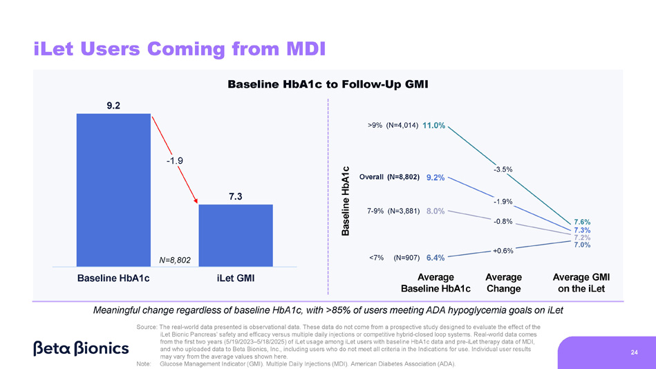 31% 5% 1% 0% 0% 0% 0% 0% 4% 0% 19% 30% 21% 12% 6% 4% 2% 2% 1% <6% 6 - 7% 7 - 8% 8 - 9% 11 - 12% 12 - 13% 13 - 14% >14% 9 - 10% 10 - 11% HbA1c and GMI Group (%) iLet Is a Population Health Tool (2/2) 23 T1D Adults HbA1c in the US 1 vs. iLet T1D Adults Follow - Up GMI 63% % T1D Adults in the US (Pettus et al., N=31,430) % T1D Adults iLet Users (Post - iLet, N=10,333) Source: The real - world data presented is observational data. These data do not come from a prospective study designed to evaluate the baseline HbA1c of iLet adult users with T1D relative to the population of adults in the U.S. with T1D. Real - world data comes from the first two years (5/19/2023 – 5/18/2025) of iLet usage among 10,333 adult iLet users with T1D with baseline HbA1c data, and who uploaded data to Beta Bionics, Inc. Individual user results may vary from the average values shown here. Note: Type 1 Diabetes (T1D), Glucose Management Indicator (GMI). 1. Pettus et al., Diabetes Care. 2019;42:2220 – 2227. Real - world study included 31,430 adults with T1D; data sourced from Optum Humedica database between July 2014 and June 2016.