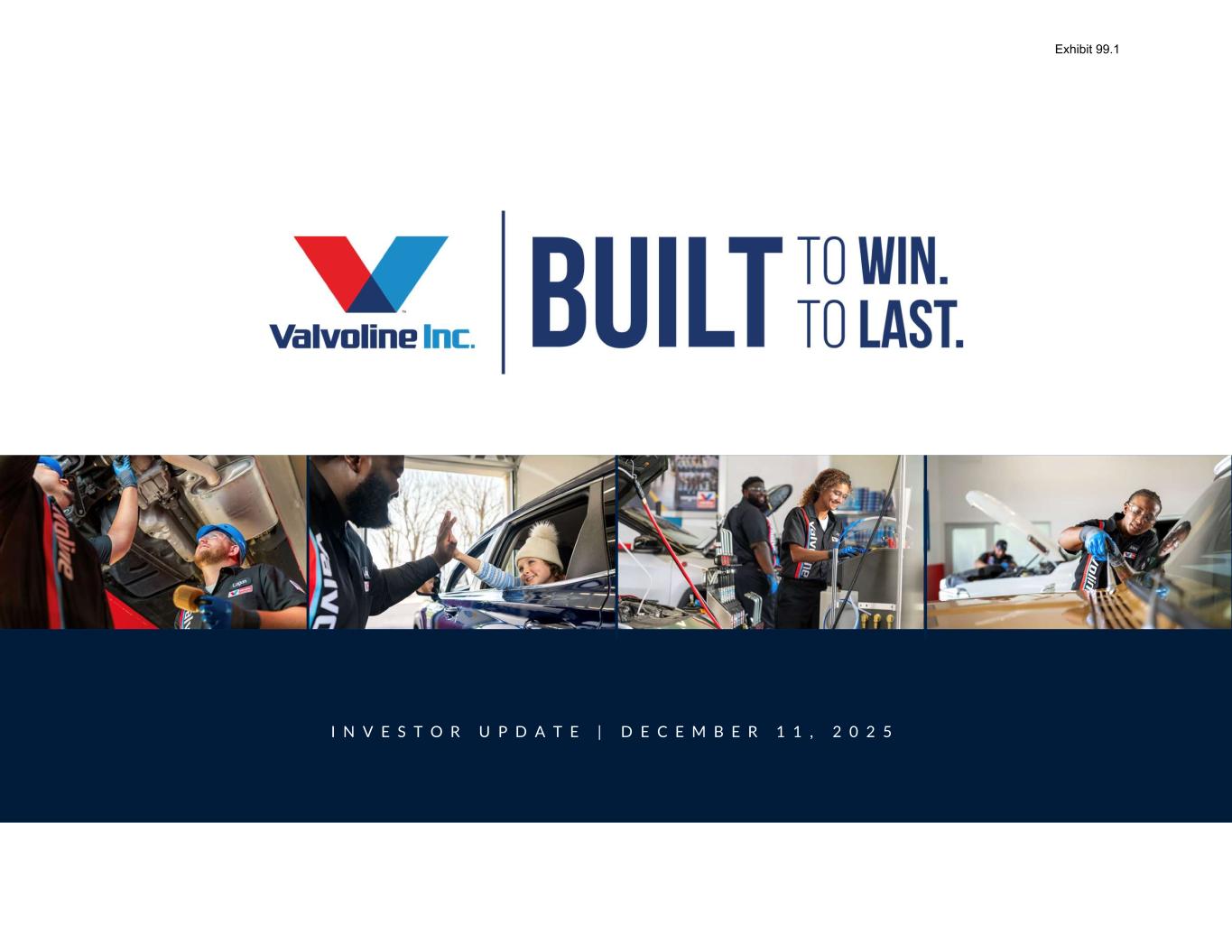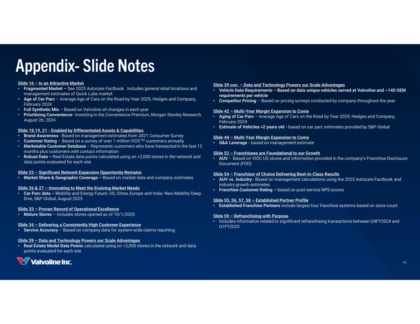 84 Appendix- Slide Notes Slide 16 – In an Attractive Market • Fragmented Market – See 2025 Autocare Factbook. Includes general retail locations and management estimates of Quick Lube market • Age of Car Parc – Average Age of Cars on the Road by Year 2029, Hedges and Company, February 2024 • Full Synthetic Mix – Based on Valvoline oil changes in each year • Prioritizing Convenience- Investing in the Convenience Premium, Morgan Stanley Research, August 26, 2024 Slide 18,19, 21 - Enabled by Differentiated Assets & Capabilities • Brand Awareness - Based on management estimates from 2021 Consumer Survey • Customer Rating – Based on a survey of over 1 million VIOCTM customers annually • Marketable Customer Database – Represents customers who have transacted in the last 12 months plus customers with contact information • Robust Data – Real Estate data points calculated using on >2,000 stores in the network and data points evaluated for each site Slide 25 – Significant Network Expansion Opportunity Remains • Market Share & Geographic Coverage – Based on market data and company estimates Slide 26 & 27 – Innovating to Meet the Evolving Market Needs • Car Parc data – Mobility and Energy Future: US, China, Europe and India- New Mobility Deep Dive, S&P Global, August 2025 Slide 33 – Proven Record of Operational Excellence • Mature Stores – includes stores opened as of 10/1/2020 Slide 34 – Delivering a Consistently High Customer Experience • Service Accuracy – Based on company data for system-wide claims reporting Slide 39 – Data and Technology Powers our Scale Advantages • Real Estate Model Data Points calculated using on >2,000 stores in the network and data points evaluated for each site • . Slide 39 con. – Data and Technology Powers our Scale Advantages • Vehicle Data Requirements – Based on data unique vehicles served at Valvoline and ~140 OEM requirements per vehicle • Competitor Pricing – Based on pricing surveys conducted by company throughout the year Slide 42 – Multi-Year Margin Expansion to Come • Aging of Car Parc – Average Age of Cars on the Road by Year 2029, Hedges and Company, February 2024 • Estimate of Vehicles <2 years old - based on car parc estimates provided by S&P Global Slide 44 – Multi-Year Margin Expansion to Come • G&A Leverage - based on management estimate Slide 52 – Franchisees are Foundational to our Growth • AUV - Based on VIOC US stores and information provided in the company’s Franchise Disclosure Document (FDD) Slide 54 – Franchisor of Choice Delivering Best-in-Class Results • AUV vs. Industry - Based on management calculations using the 2025 Autocare Factbook and industry growth estimates • Franchise Customer Rating – based on post-service NPS scores Slide 55, 56, 57, 58 – Established Partner Profile • Established Franchise Partners include largest four franchise systems based on store count Slide 59 – Refranchising with Purpose • Includes information related to significant refranchising transactions between Q4FY2024 and Q1FY2025