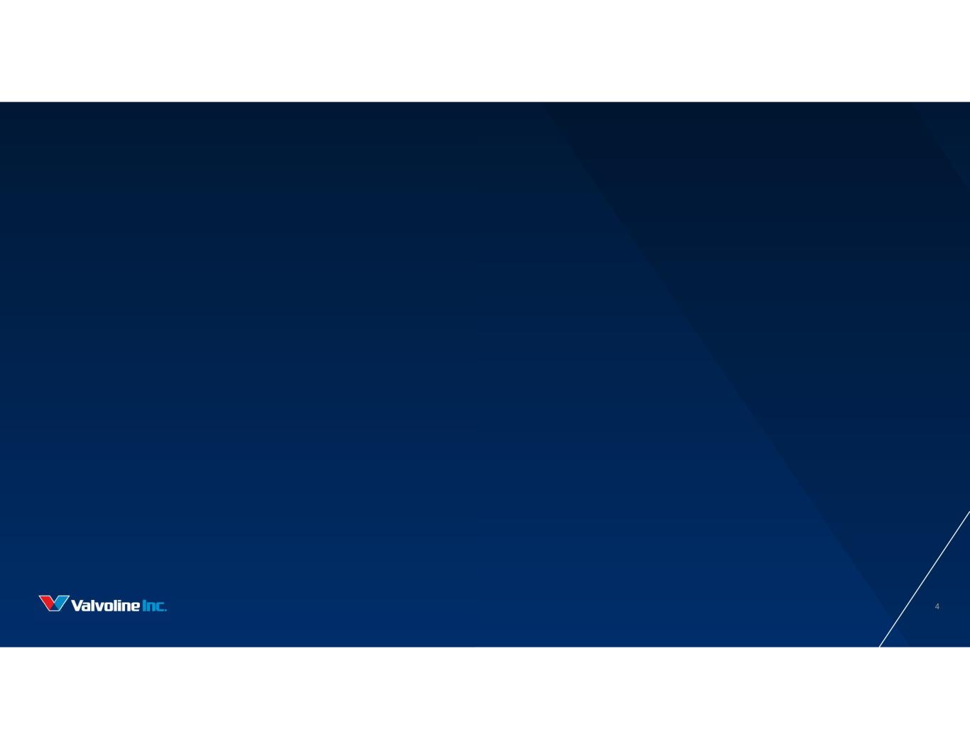 Safe Harbor 3 Forward-Looking Statements Certain statements herein, other than statements of historical fact, are forward-looking statements within the meaning of the Private Securities Litigation Reform Act of 1995. Such forward-looking statements may include, without limitation, statements about the acquisition of Breeze Autocare, including its Oil Changers stores, and the integration of the Breeze Autocare business and the anticipated benefits and synergies of the acquisition; executing on the growth strategy to create shareholder value by driving the full potential in Valvoline’s core business, delivering sustainable network growth and innovating to meet the changing needs of customers and the car parc; realizing the benefits from acquisitions and refranchising transactions; and future opportunities for the stand-alone retail business; and any other statements regarding Valvoline's future operations, financial or operating results, capital allocation, debt leverage ratio, anticipated business levels, dividend policy, anticipated growth, market opportunities, strategies, competition, and other expectations and targets for future periods. Valvoline has identified some of these forward-looking statements with words such as “anticipates,” “believes,” “expects,” “estimates,” “is likely,” “predicts,” “projects,” “forecasts,” “may,” “will,” “should,” and “intends,” and the negative of these words or other comparable terminology. These forward-looking statements are based on Valvoline’s current expectations, estimates, projections, and assumptions as of the date such statements are made and are subject to risks and uncertainties that may cause results to differ materially from those expressed or implied in the forward-looking statements. Additional information regarding these risks and uncertainties are described in Valvoline’s filings with the Securities and Exchange Commission (the “SEC”), including in the “Risk Factors,” “Management’s Discussion and Analysis of Financial Condition and Results of Operations,” and “Quantitative and Qualitative Disclosures about Market Risk” sections of Valvoline’s most recently filed periodic reports on Forms 10-K and 10-Q, which are available on Valvoline’s website at http://investors.valvoline.com/sec-filings or on the SEC’s website at http://www.sec.gov. Valvoline assumes no obligation to update or revise these forward-looking statements for any reason, even if new information becomes available in the future, unless required by law. Regulation G: Adjusted Results The information presented herein, regarding certain financial measures that do not conform to generally accepted accounting principles in the United States (U.S. GAAP), should not be construed as an alternative to the reported results determined in accordance with U.S. GAAP. Valvoline has included this non-GAAP information to assist in understanding the operating performance of the company. The non-GAAP information provided may not be consistent with the methodologies used by other companies. Information regarding Valvoline’s definitions, calculations and reconciliations of non-GAAP measures can be found in the tables attached to Valvoline’s earnings press releases dated November 19, 2025 and November 9, 2023, which are available at Valvoline’s website at https://investors.valvoline.com/financials/quarterly-results/. Data Sources See Appendix for additional information regarding certain financial information and data used in this Presentation.