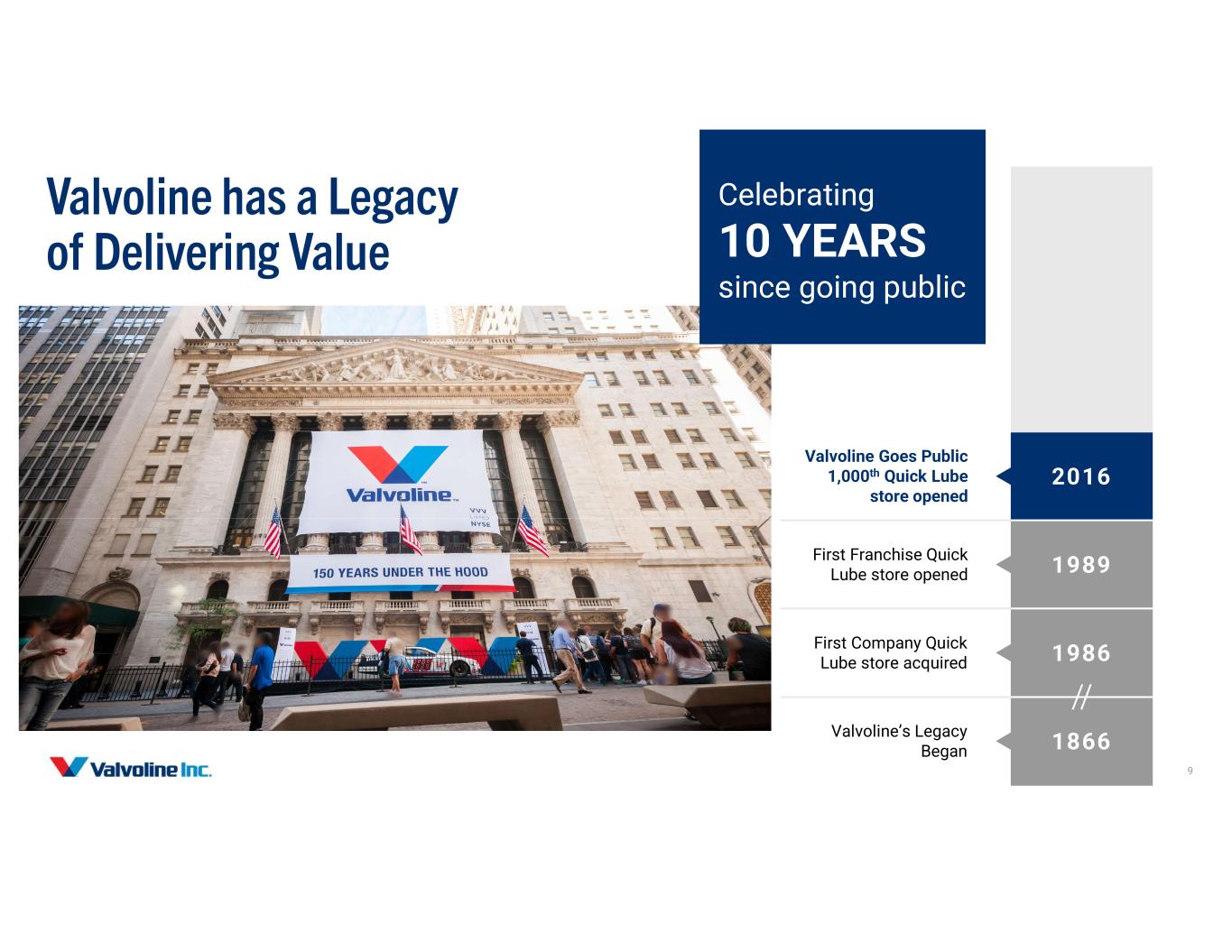 Valvoline has a Legacy of Delivering Value Valvoline’s Legacy Began First Company Quick Lube store acquired First Franchise Quick Lube store opened 1866 1986 1989 2016 2021 2023 TODAY 8 Celebrating 40 YEARS in Retail