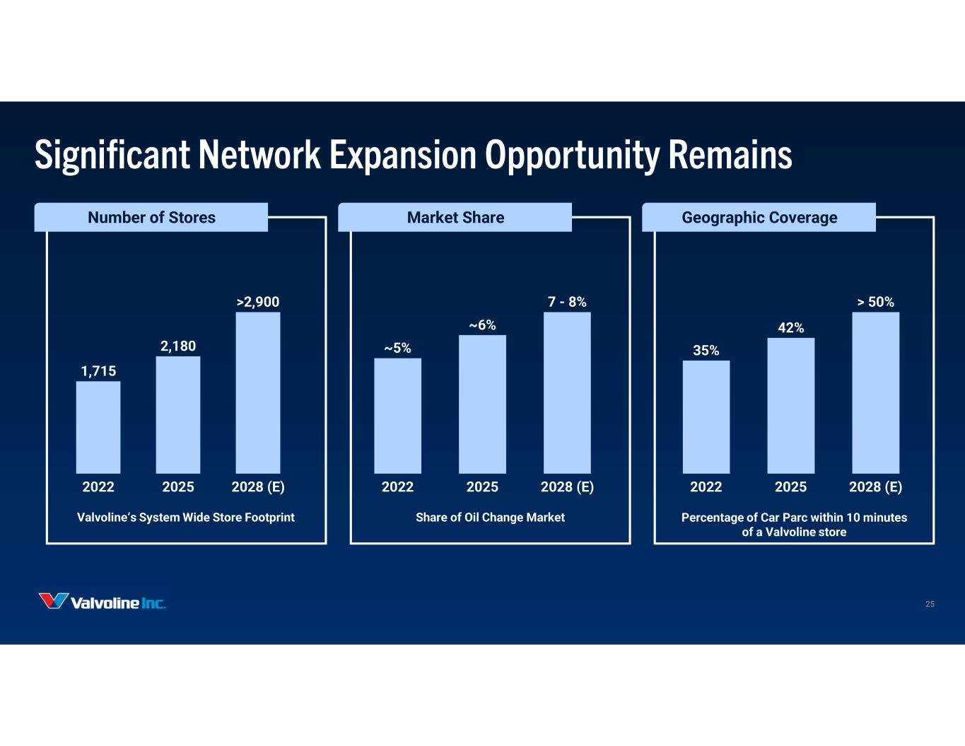 Significant Network Expansion Opportunity Remains 1,715 2,180 2022 2025 2028 (E) >2,900 2022 2025 2028 (E) ~5% ~6% 7 - 8% 2022 2025 2028 (E) 35% 42% > 50% Number of Stores Market Share Geographic Coverage Valvoline’s System Wide Store Footprint Share of Oil Change Market Percentage of Car Parc within 10 minutes of a Valvoline store 25