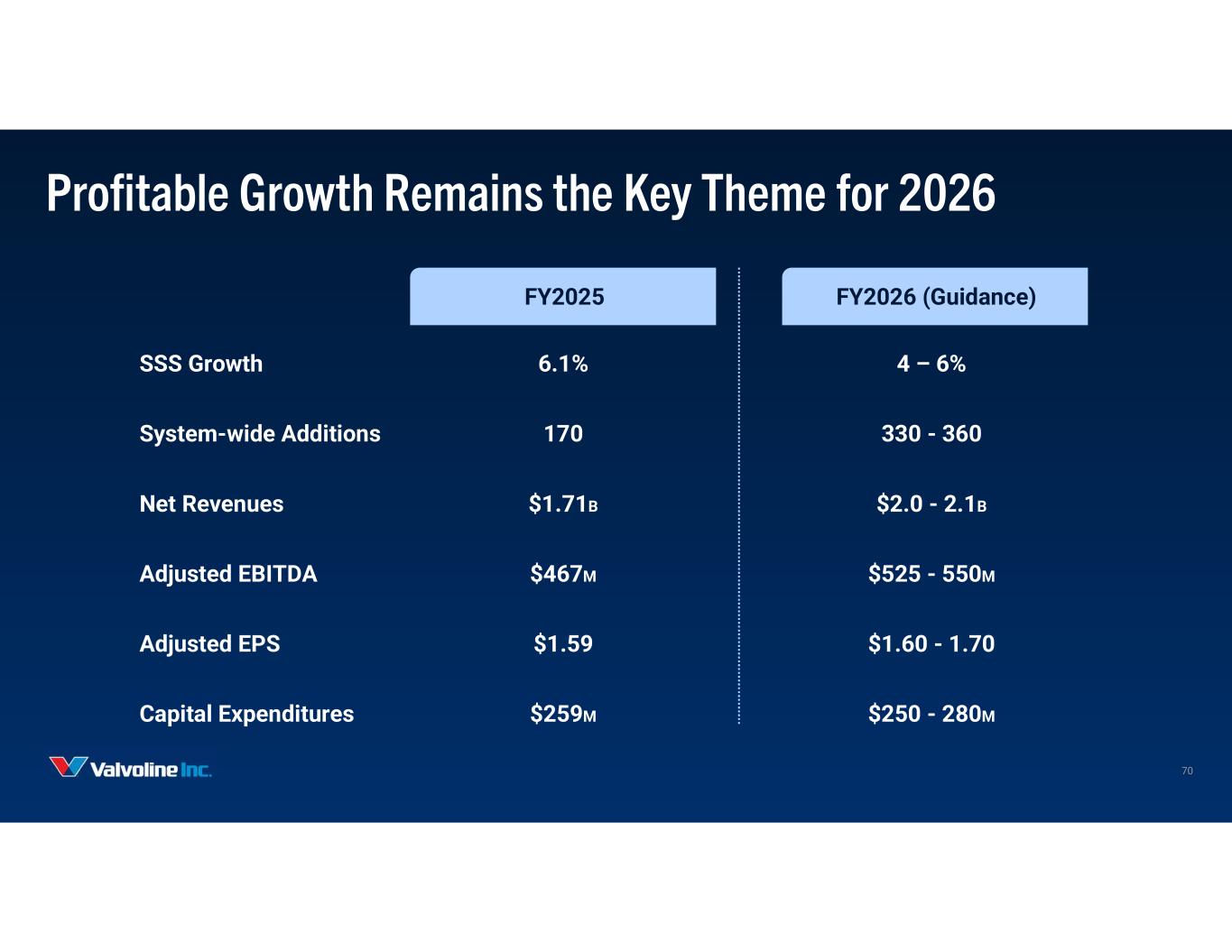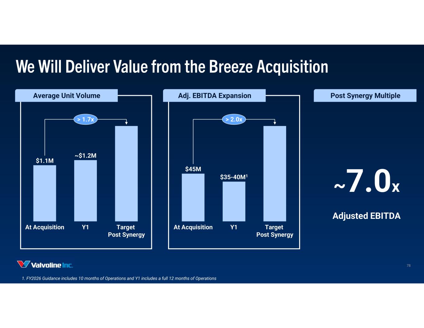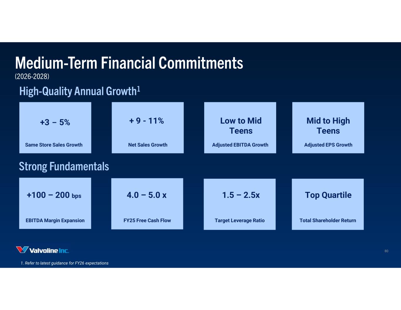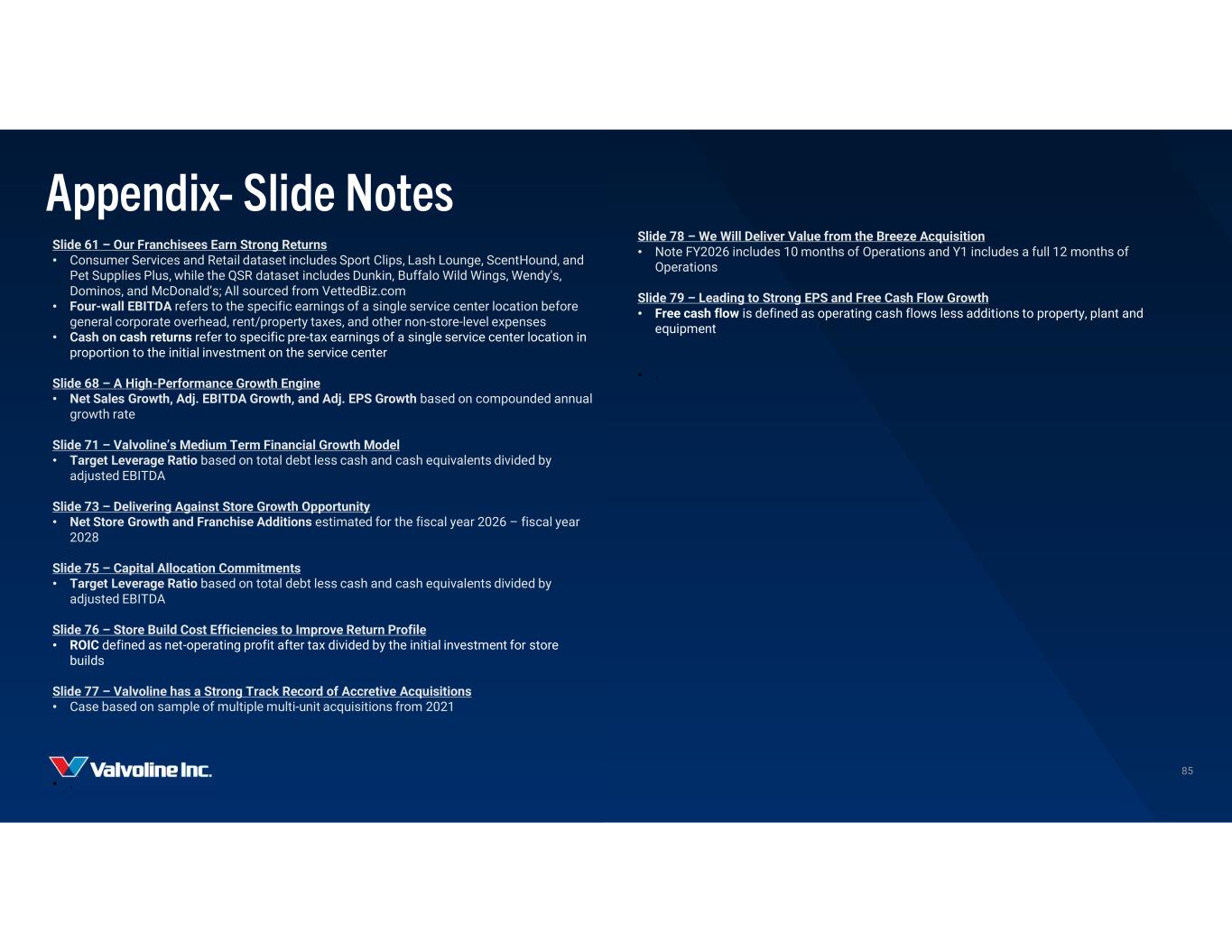 85 Appendix- Slide Notes Slide 61 – Our Franchisees Earn Strong Returns • Consumer Services and Retail dataset includes Sport Clips, Lash Lounge, ScentHound, and Pet Supplies Plus, while the QSR dataset includes Dunkin, Buffalo Wild Wings, Wendy's, Dominos, and McDonald’s; All sourced from VettedBiz.com • Four-wall EBITDA refers to the specific earnings of a single service center location before general corporate overhead, rent/property taxes, and other non-store-level expenses • Cash on cash returns refer to specific pre-tax earnings of a single service center location in proportion to the initial investment on the service center Slide 68 – A High-Performance Growth Engine • Net Sales Growth, Adj. EBITDA Growth, and Adj. EPS Growth based on compounded annual growth rate Slide 71 – Valvoline’s Medium Term Financial Growth Model • Target Leverage Ratio based on total debt less cash and cash equivalents divided by adjusted EBITDA Slide 73 – Delivering Against Store Growth Opportunity • Net Store Growth and Franchise Additions estimated for the fiscal year 2026 – fiscal year 2028 Slide 75 – Capital Allocation Commitments • Target Leverage Ratio based on total debt less cash and cash equivalents divided by adjusted EBITDA Slide 76 – Store Build Cost Efficiencies to Improve Return Profile • ROIC defined as net-operating profit after tax divided by the initial investment for store builds Slide 77 – Valvoline has a Strong Track Record of Accretive Acquisitions • Case based on sample of multiple multi-unit acquisitions from 2021 • . Slide 78 – We Will Deliver Value from the Breeze Acquisition • Note FY2026 includes 10 months of Operations and Y1 includes a full 12 months of Operations Slide 79 – Leading to Strong EPS and Free Cash Flow Growth • Free cash flow is defined as operating cash flows less additions to property, plant and equipment • .