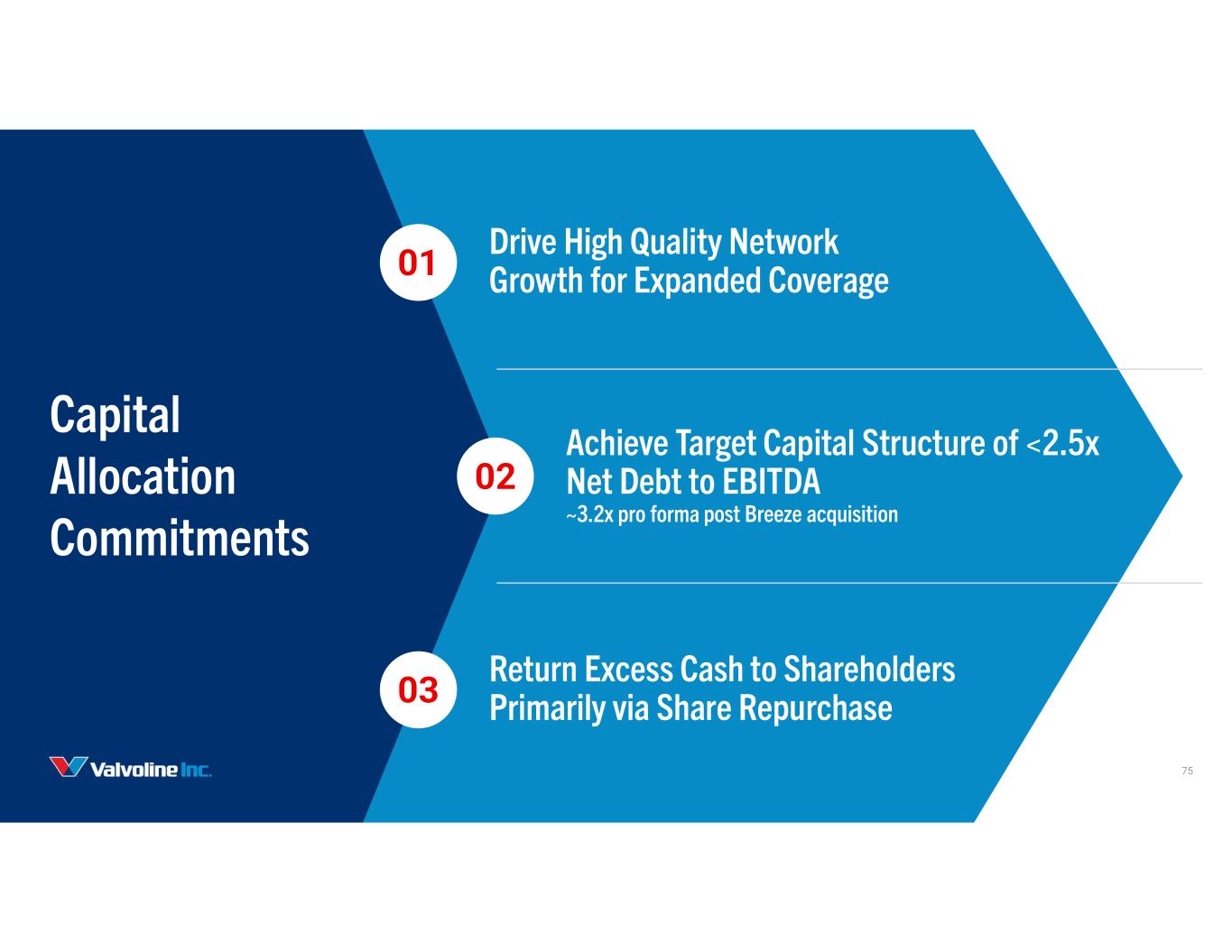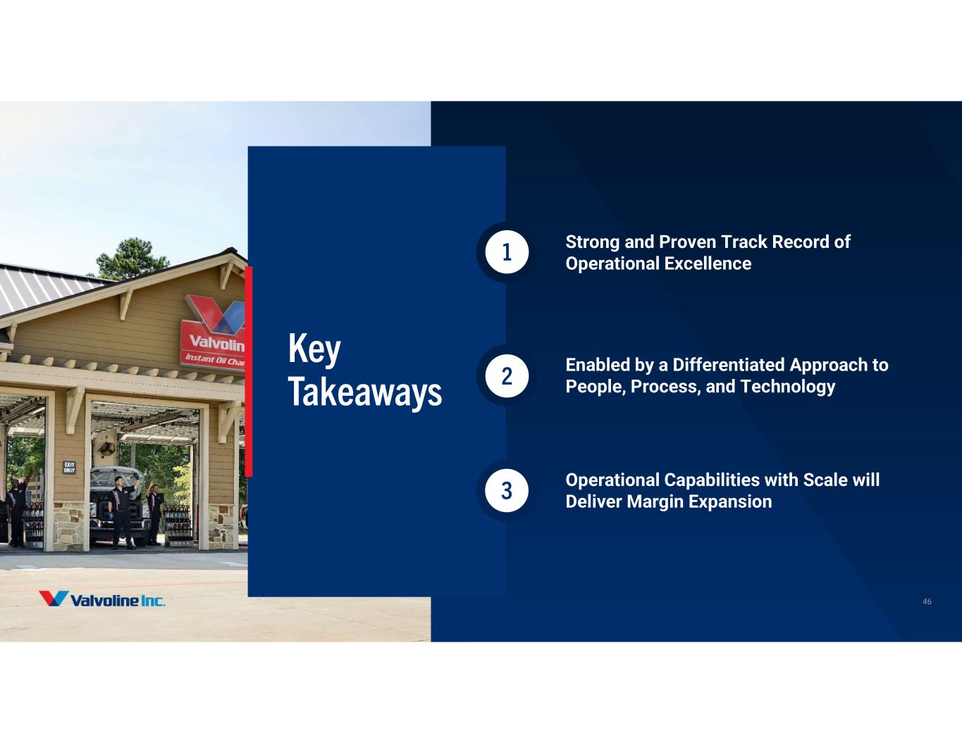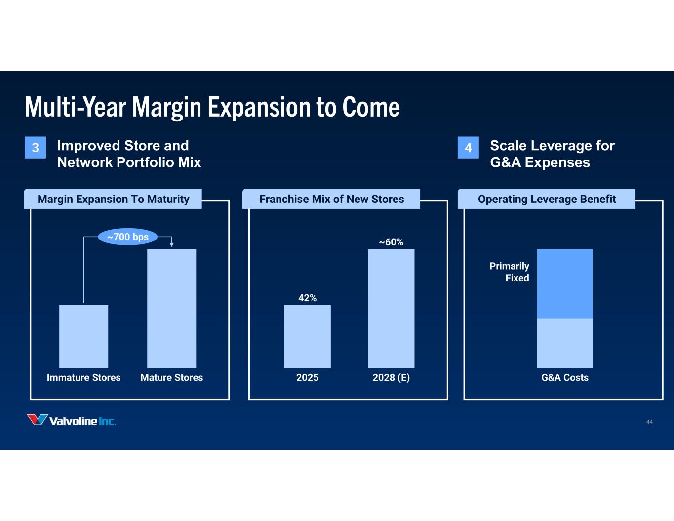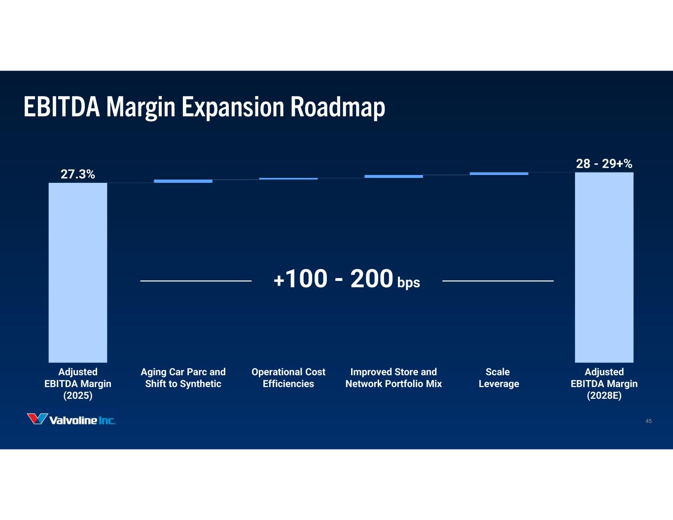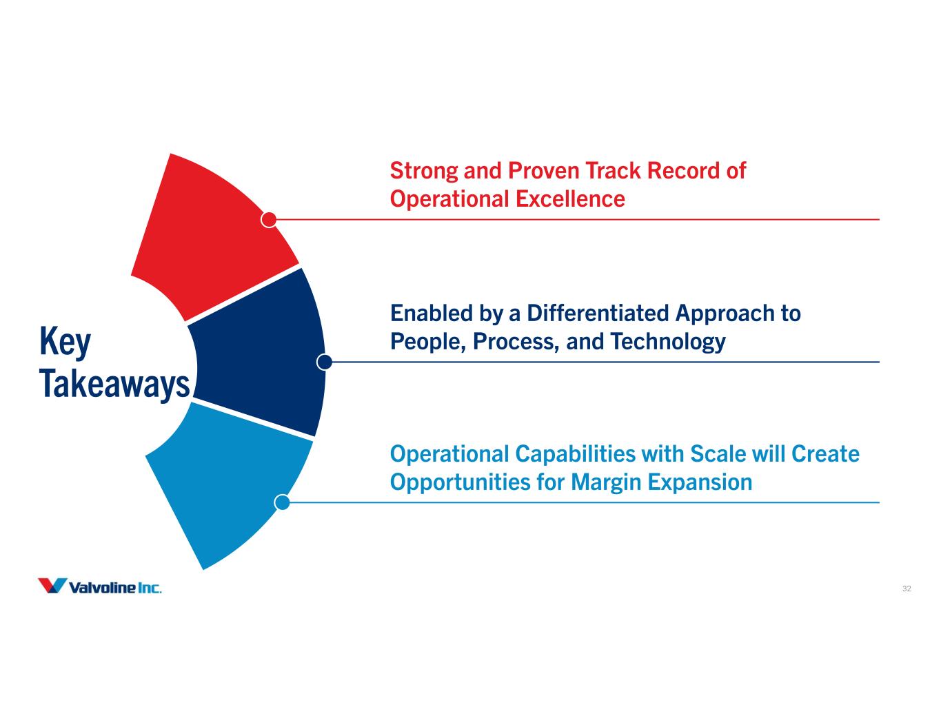 85 Appendix- Slide Notes Slide 61 – Our Franchisees Earn Strong Returns • Consumer Services and Retail dataset includes Sport Clips, Lash Lounge, ScentHound, and Pet Supplies Plus, while the QSR dataset includes Dunkin, Buffalo Wild Wings, Wendy's, Dominos, and McDonald’s; All sourced from VettedBiz.com • Four-wall EBITDA refers to the specific earnings of a single service center location before general corporate overhead, rent/property taxes, and other non-store-level expenses • Cash on cash returns refer to specific pre-tax earnings of a single service center location in proportion to the initial investment on the service center Slide 68 – A High-Performance Growth Engine • Net Sales Growth, Adj. EBITDA Growth, and Adj. EPS Growth based on compounded annual growth rate Slide 71 – Valvoline’s Medium Term Financial Growth Model • Target Leverage Ratio based on total debt less cash and cash equivalents divided by adjusted EBITDA Slide 73 – Delivering Against Store Growth Opportunity • Net Store Growth and Franchise Additions estimated for the fiscal year 2026 – fiscal year 2028 Slide 75 – Capital Allocation Commitments • Target Leverage Ratio based on total debt less cash and cash equivalents divided by adjusted EBITDA Slide 76 – Store Build Cost Efficiencies to Improve Return Profile • ROIC defined as net-operating profit after tax divided by the initial investment for store builds Slide 77 – Valvoline has a Strong Track Record of Accretive Acquisitions • Case based on sample of multiple multi-unit acquisitions from 2021 • . Slide 78 – We Will Deliver Value from the Breeze Acquisition • Note FY2026 includes 10 months of Operations and Y1 includes a full 12 months of Operations Slide 79 – Leading to Strong EPS and Free Cash Flow Growth • Free cash flow is defined as operating cash flows less additions to property, plant and equipment • .