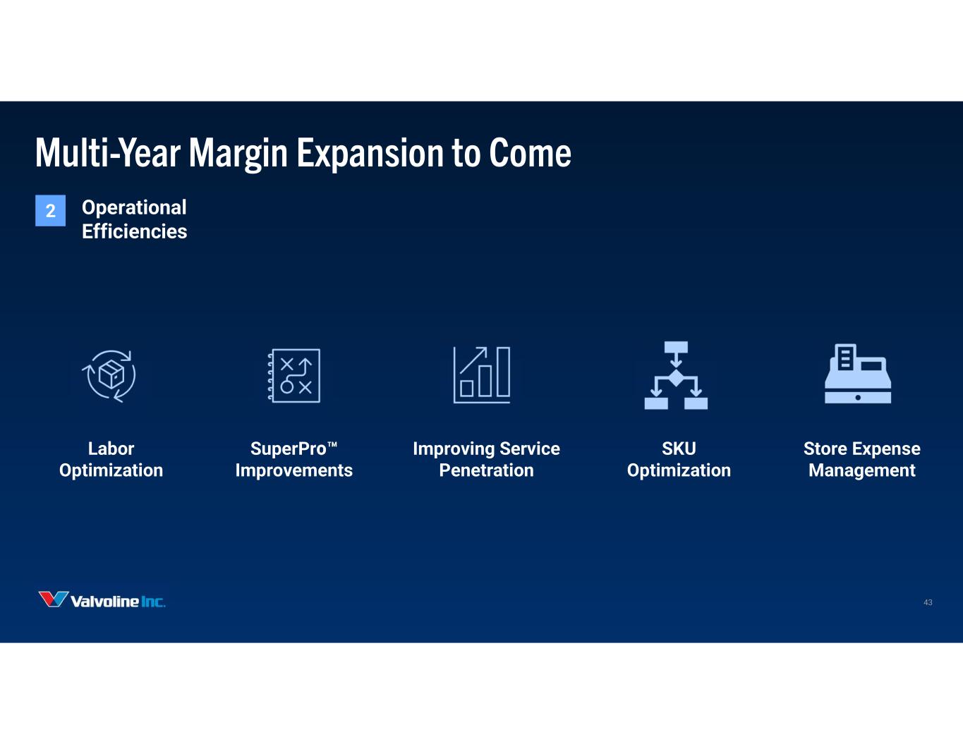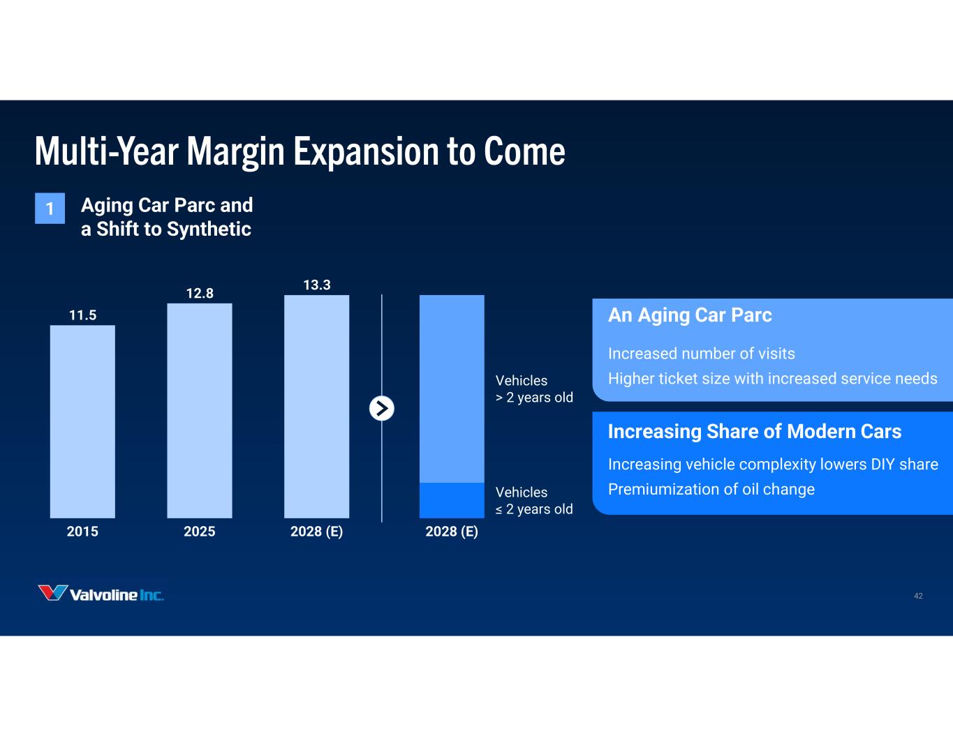 Multi-Year Margin Expansion to Come 1 Aging Car Parc and a Shift to Synthetic 11.5 12.8 13.3 2015 2025 2028 (E) 2028 (E) Vehicles > 2 years old Vehicles ≤ 2 years old An Aging Car Parc Increased number of visits Higher ticket size with increased service needs Increasing Share of Modern Cars Increasing vehicle complexity lowers DIY share Premiumization of oil change 42
