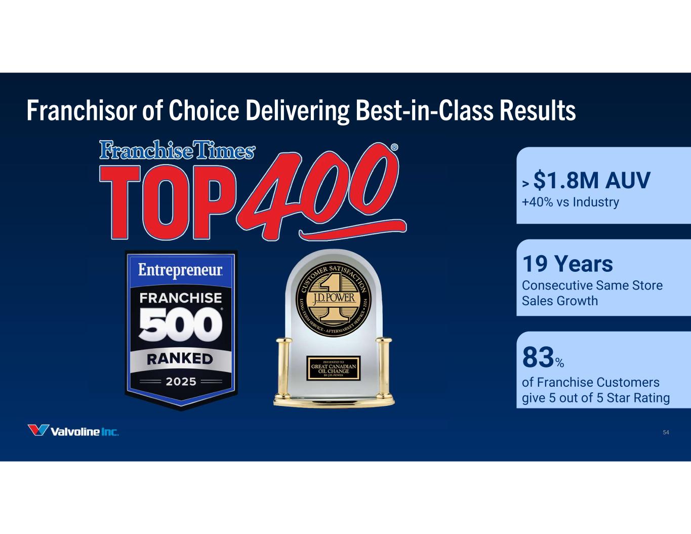 Franchisees are Foundational to our Growth 52 VIOCSM Franchisees have the highest AUV in the Quick Lube Industry $1.5M $1.8M 2022 2023 2024 2025 Valvoline’s Average Unit Volume (AUV) Company Franchise