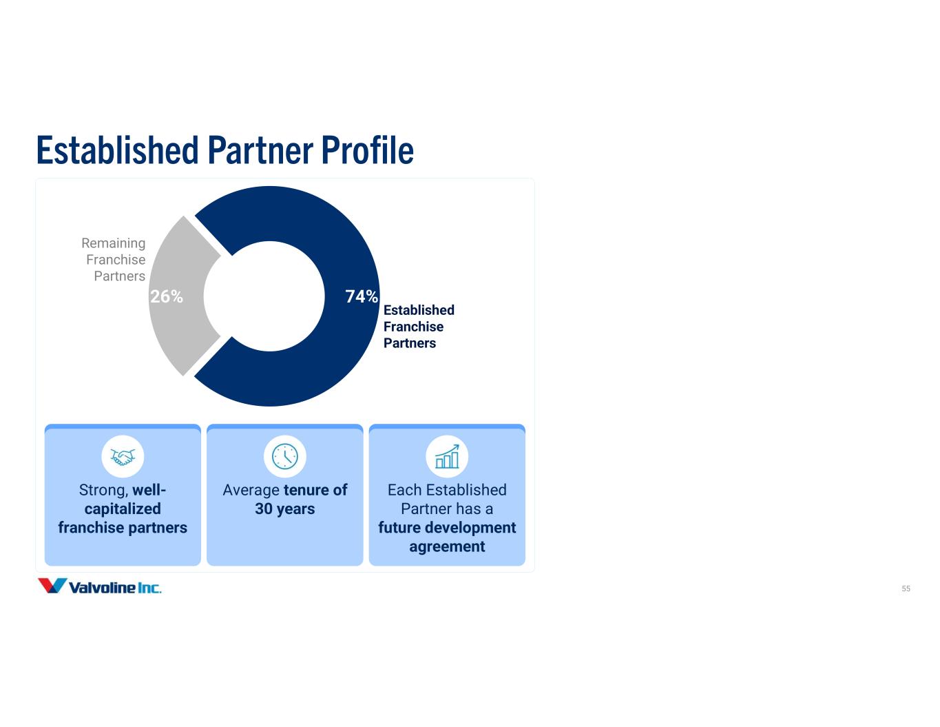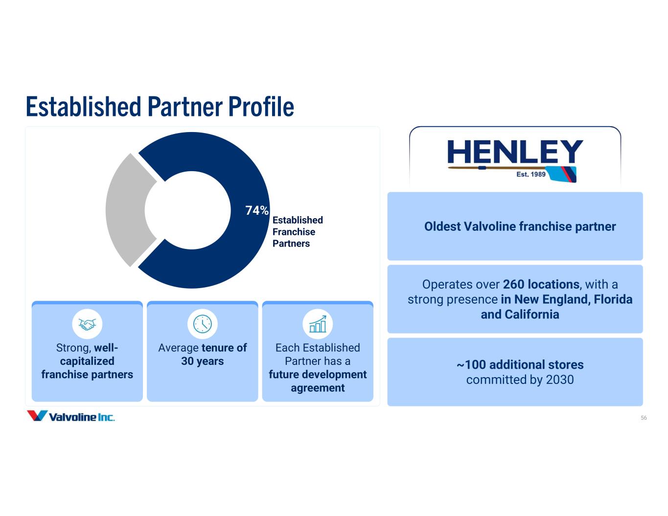 Established Partner Profile Strong, well- capitalized franchise partners Average tenure of 30 years Each Established Partner has a future development agreement Oldest Valvoline franchise partner ~100 additional stores committed by 2030 Operates over 260 locations, with a strong presence in New England, Florida and California 74% Established Franchise Partners Remaining Franchise Partners 56