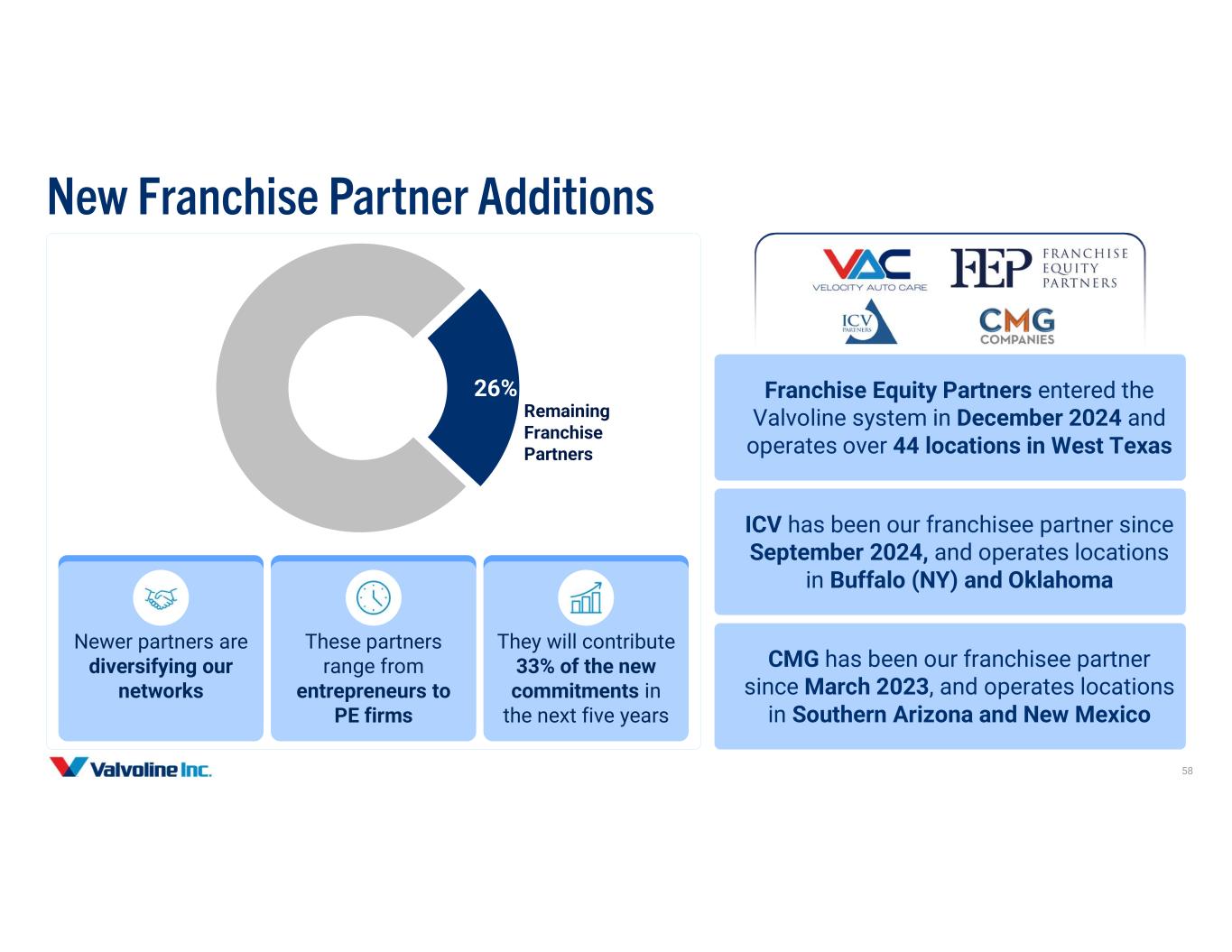 New Franchise Partner Additions Newer partners are diversifying our networks These partners range from entrepreneurs to PE firms They will contribute 33% of the new commitments in the next five years Franchise Equity Partners entered the Valvoline system in December 2024 and operates over 44 locations in West Texas CMG has been our franchisee partner since March 2023, and operates locations in Southern Arizona and New Mexico ICV has been our franchisee partner since September 2024, and operates locations in Buffalo (NY) and Oklahoma 26% Established Franchise Partners Remaining Franchise Partners 58