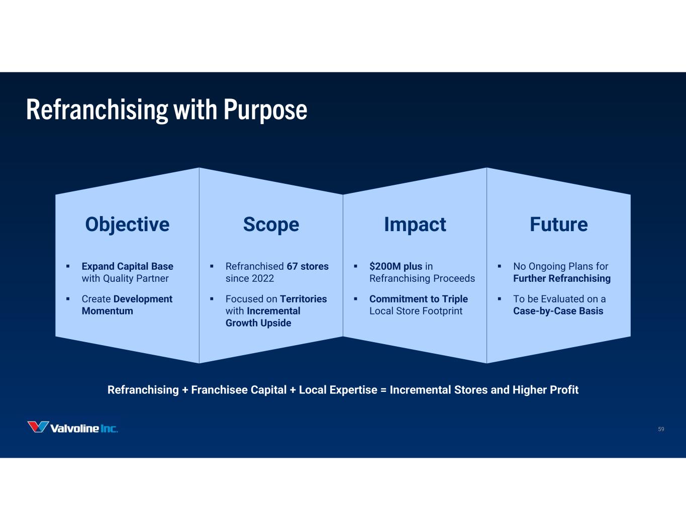 Refranchising with Purpose Expand Capital Base with Quality Partner Create Development Momentum Objective Refranchised 67 stores since 2022 Focused on Territories with Incremental Growth Upside Scope $200M plus in Refranchising Proceeds Commitment to Triple Local Store Footprint Impact No Ongoing Plans for Further Refranchising To be Evaluated on a Case-by-Case Basis Future Refranchising + Franchisee Capital + Local Expertise = Incremental Stores and Higher Profit 59