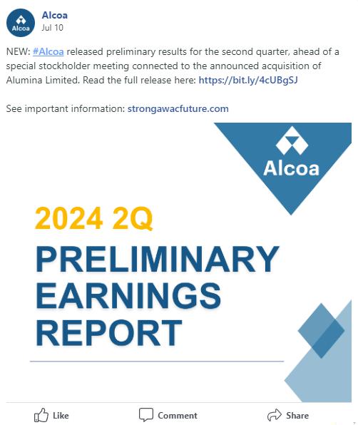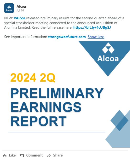 Item 1: On July 10, 2024, Alcoa published a message on LinkedIn, which is filed herewith as Exhibit 1.