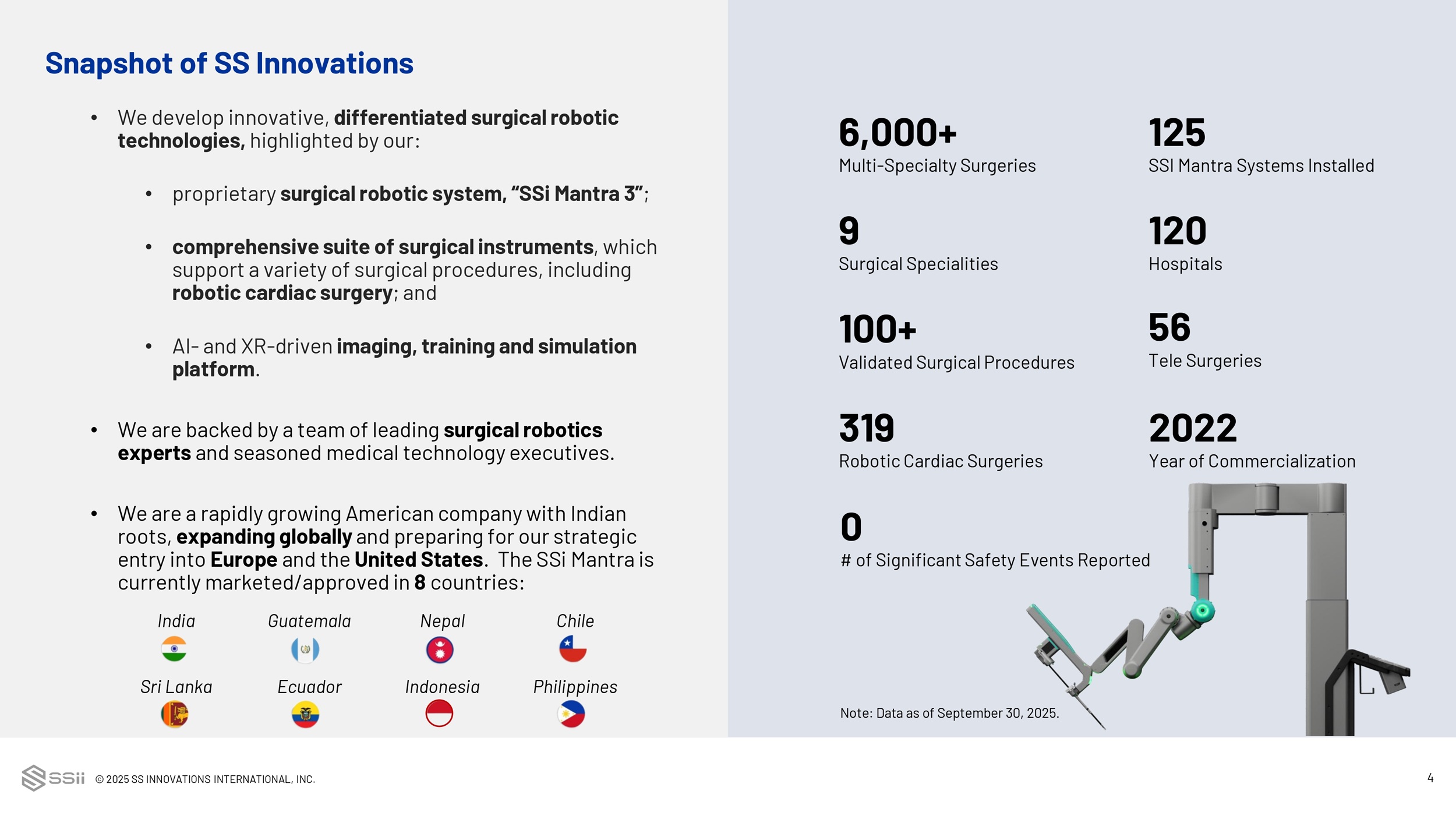 © 2025 SS INNOVATIONS INTERNATIONAL, INC. 2 No Offering of Securities No offer is made by this Company Presentation (this “ Presentation ”) to invest in SS Innovations International, Inc . (the “ Company ”) or to purchase any of its securities . Any offer to make such an investment or purchase and such investment or purchase will be made only pursuant to definitive offering documentation furnished by the Company . Forward - Looking Statements This Presentation contains forward - looking statements within the meaning of Section 27 A of the Securities Act of 1933 , as amended (the “Securities Act” ), and Section 21 E of the Securities Exchange Act of 1934 , as amended . These statements involve known and unknown risks, uncertainties and other factors that may cause our actual results, performance or achievements to be materially different from any future results, performance or achievements expressed or implied by our forward - looking statements . Examples of forward - looking statements include statements regarding the benefits, uses and safety of our products, projected financial information, statements of our plans and objectives for future operations and statements concerning proposed new products and services . In some cases, you can identify forward - looking statements by the use of terminology such as “may,” “will,” “should,” “could,” “expects,” “plans,” “intends,” “anticipates,” “believes,” “estimates,” “predicts,” “potential” and other comparable terminology . Although we believe that the expectations reflected in the forward - looking statements are reasonable, we cannot guarantee future results, performance or achievements . Actual events or results may differ materially . We undertake no obligation to update any of the forward - looking statements after the date of this Presentation to conform them to actual results . Please refer to the risk factors described in the "Risk Factors" section and other sections included in the Company's Annual Report on Form 10 - K, Quarterly Reports on Form 10 - Q and other filings with the SEC . Statistical and Other Industry and Market Data This Presentation includes statistical and other industry and market data that we obtained from industry publications and research, surveys and studies conducted by third parties as well as our own estimates of potential market opportunities . All of the market data used in this Presentation involves a number of assumptions and limitations, and you are cautioned not to give undue weight to such data . Industry publications and third - party research, surveys and studies generally indicate that their information has been obtained from sources believed to be reliable, although they do not guarantee the accuracy or completeness of such information . Our estimates of the potential market opportunities for our product candidates include several key assumptions based on our industry knowledge, industry publications, third - party research and other surveys, which may be based on a small sample size and may fail to accurately reflect market opportunities . While we believe that our internal assumptions are reasonable, and management is responsible for the accuracy of such assumptions and data, no independent source has verified such assumptions . Disclaimers