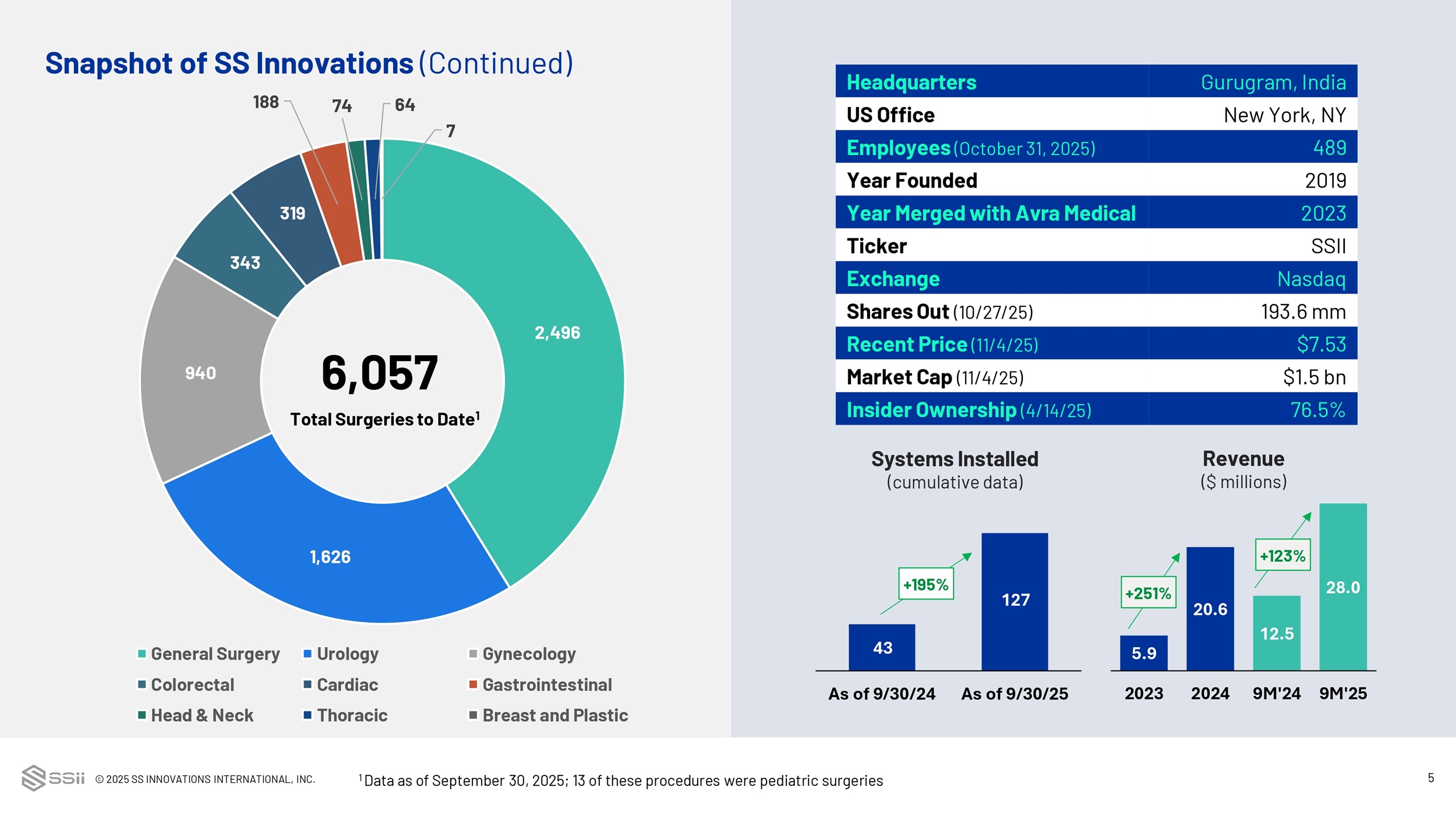 © 2025 SS INNOVATIONS INTERNATIONAL, INC. 4 Snapshot of SS Innovations • We develop innovative, differentiated surgical robotic technologies, highlighted by our: • proprietary surgical robotic system, “SSi Mantra 3” ; • comprehensive suite of surgical instruments , which support a variety of surgical procedures, including robotic cardiac surgery ; and • AI - and XR - driven imaging, training and simulation platform . • We are backed by a team of leading surgical robotics experts and seasoned medical technology executives. • We are a rapidly growing American company with Indian roots, expanding globally and preparing for our strategic entry into Europe and the United States . The SSi Mantra is currently marketed/approved in 8 countries: 6,000+ Multi - Specialty Surgeries 125 SSI Mantra Systems Installed 120 Hospitals 100+ Validated Surgical Procedures 9 Surgical Specialities 319 Robotic Cardiac Surgeries 56 Tele Surgeries 0 # of Significant Safety Events Reported Note: Data as of September 30, 2025. 2022 Year of Commercialization Chile Nepal Guatemala India Philippines Indonesia Ecuador Sri Lanka