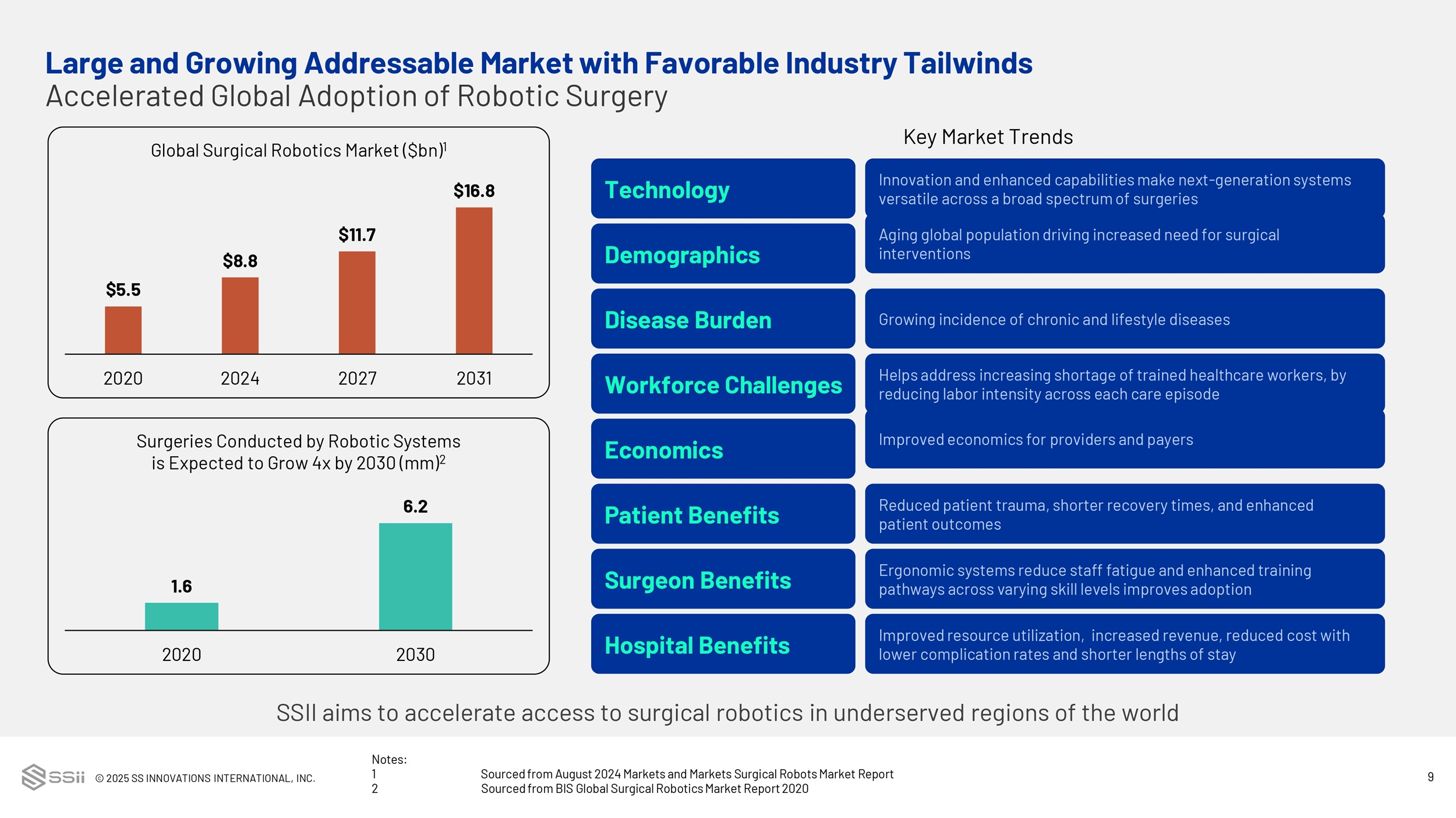© 2025 SS INNOVATIONS INTERNATIONAL, INC. 8 Distinguished Leadership and Board with Proven Track Record in Surgical Robotics Technology (cont.) Naveen Kumar Amar , Chief Financial Officer • Former Head of Finance & Commercial, SpiceXpress • Former Global CFO, Munch Ado India • Former SVP, Finance of MSD Wellcome Trust Hilleman Laboratories • Former CFO – India & Australia, EDirect • Former India Manager – Financial Consolidation, GE India • Chartered Accountant, Institute of Chartered Accountants of India Barry Cohen, COO – Americas & Board Member • Co - Founder, CEO and Director, Avra Medical Robotics • Former Director and President, Synalloy Corp. • Former Chairman of the Board, Wolverine Technologies, Inc. Tim Paul Adams, Board Member • Regional Operating Officer, Ascension • Former Regional CEO, Tenet Healthcare • Chairman, Tennessee Hospital Association Somashekhar SP, MD, Board Member • Robotic Surgeon • Global Director, Aster International Institute of Oncology Dr. Mylswamy Annadurai, Board Member • Former Director, Indian Space Research Organization (ISRO)