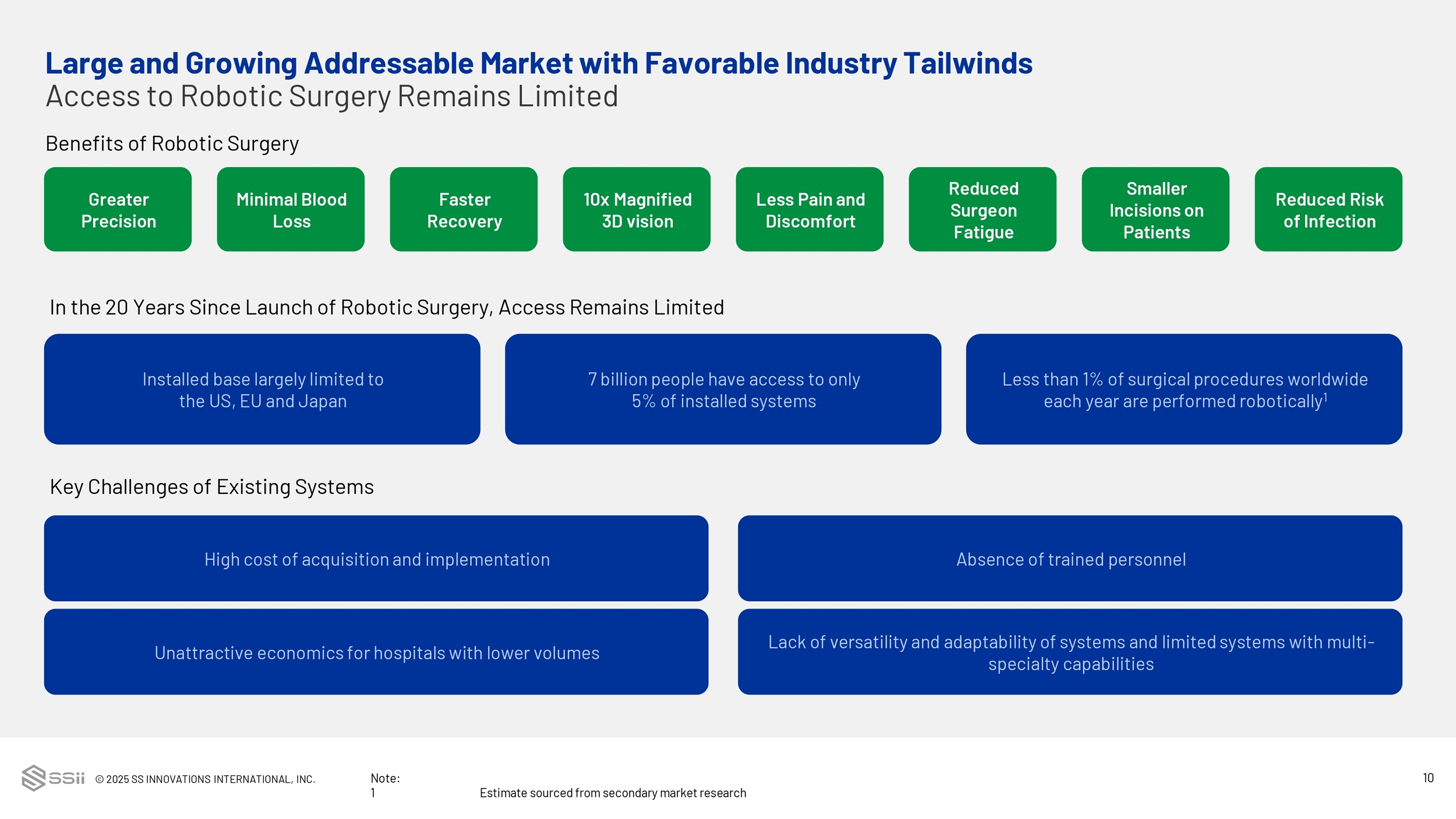 © 2025 SS INNOVATIONS INTERNATIONAL, INC. 9 Demographics Disease Burden Workforce Challenges Economics Patient Benefits Surgeon Benefits Improved resource utilization, increased revenue, reduced cost with lower complication rates and shorter lengths of stay $5.5 $8.8 $11.7 $16.8 2020 2024 2027 2031 Global Surgical Robotics Market ($bn) 1 1.6 6.2 2020 2030 Surgeries Conducted by Robotic Systems is Expected to Grow 4x by 2030 (mm) 2 SSII aims to accelerate access to surgical robotics in underserved regions of the world Key Market Trends Technology Innovation and enhanced capabilities make next - generation systems versatile across a broad spectrum of surgeries Aging global population driving increased need for surgical interventions Growing incidence of chronic and lifestyle diseases Helps address increasing shortage of trained healthcare workers, by reducing labor intensity across each care episode Improved economics for providers and payers Reduced patient trauma, shorter recovery times, and enhanced patient outcomes Ergonomic systems reduce staff fatigue and enhanced training pathways across varying skill levels improves adoption Hospital Benefits Notes: 1 Sourced from August 2024 Markets and Markets Surgical Robots Market Report 2 Sourced from BIS Global Surgical Robotics Market Report 2020 Large and Growing Addressable Market with Favorable Industry Tailwinds Accelerated Global Adoption of Robotic Surgery