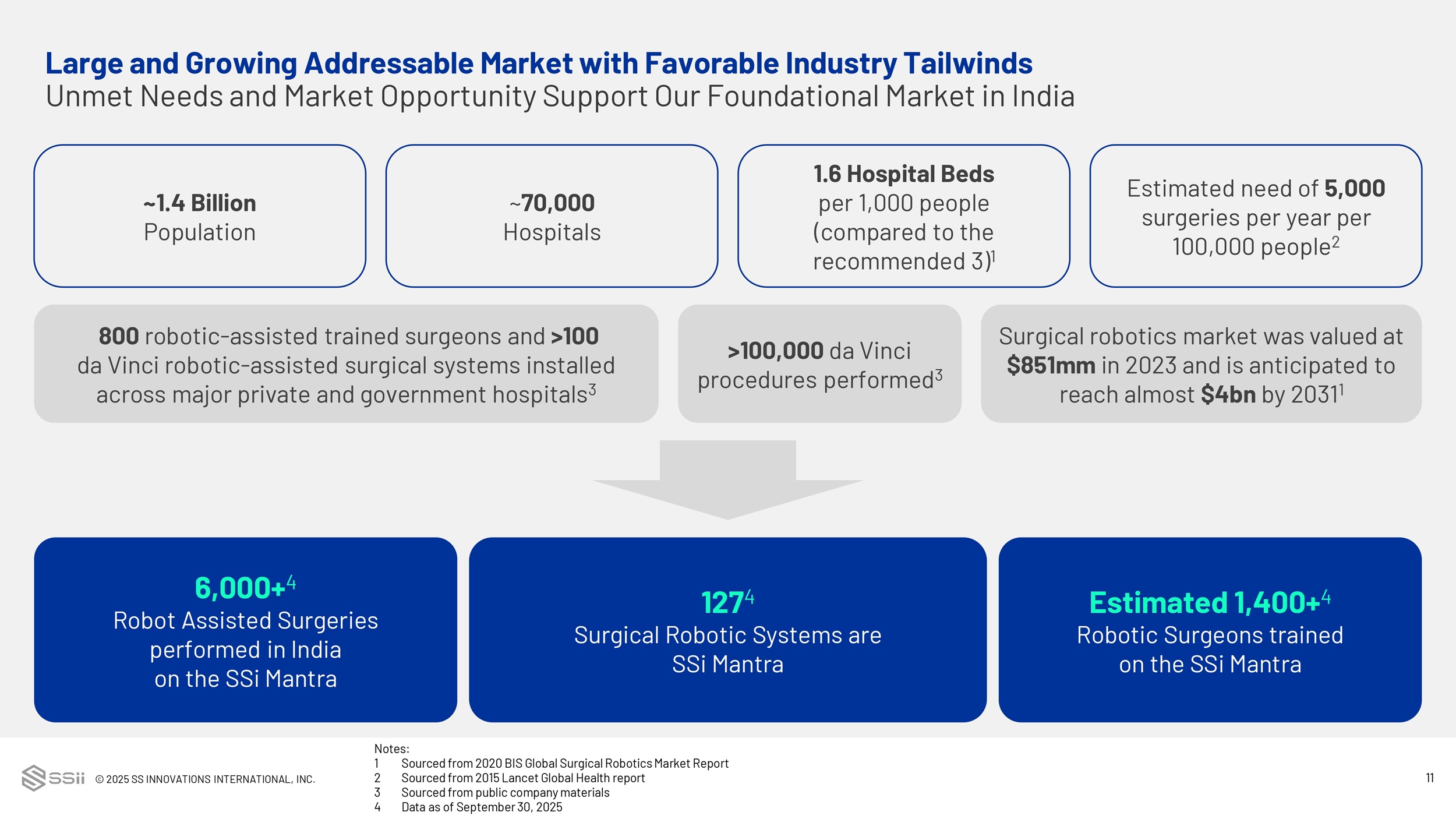 © 2025 SS INNOVATIONS INTERNATIONAL, INC. 10 Benefits of Robotic Surgery In the 20 Years Since Launch of Robotic Surgery, Access Remains Limited Installed base largely limited to the US, EU and Japan 7 billion people have access to only 5% of installed systems Less than 1% of surgical procedures worldwide each year are performed robotically 1 Key Challenges of Existing Systems High cost of acquisition and implementation Unattractive economics for hospitals with lower volumes Absence of trained personnel Lack of versatility and adaptability of systems and limited systems with multi - specialty capabilities Greater Precision Minimal Blood Loss Faster Recovery 10x Magnified 3D vision Less Pain and Discomfort Reduced Surgeon Fatigue Smaller Incisions on Patients Reduced Risk of Infection Note: 1 Estimate sourced from secondary market research Large and Growing Addressable Market with Favorable Industry Tailwinds Access to Robotic Surgery Remains Limited