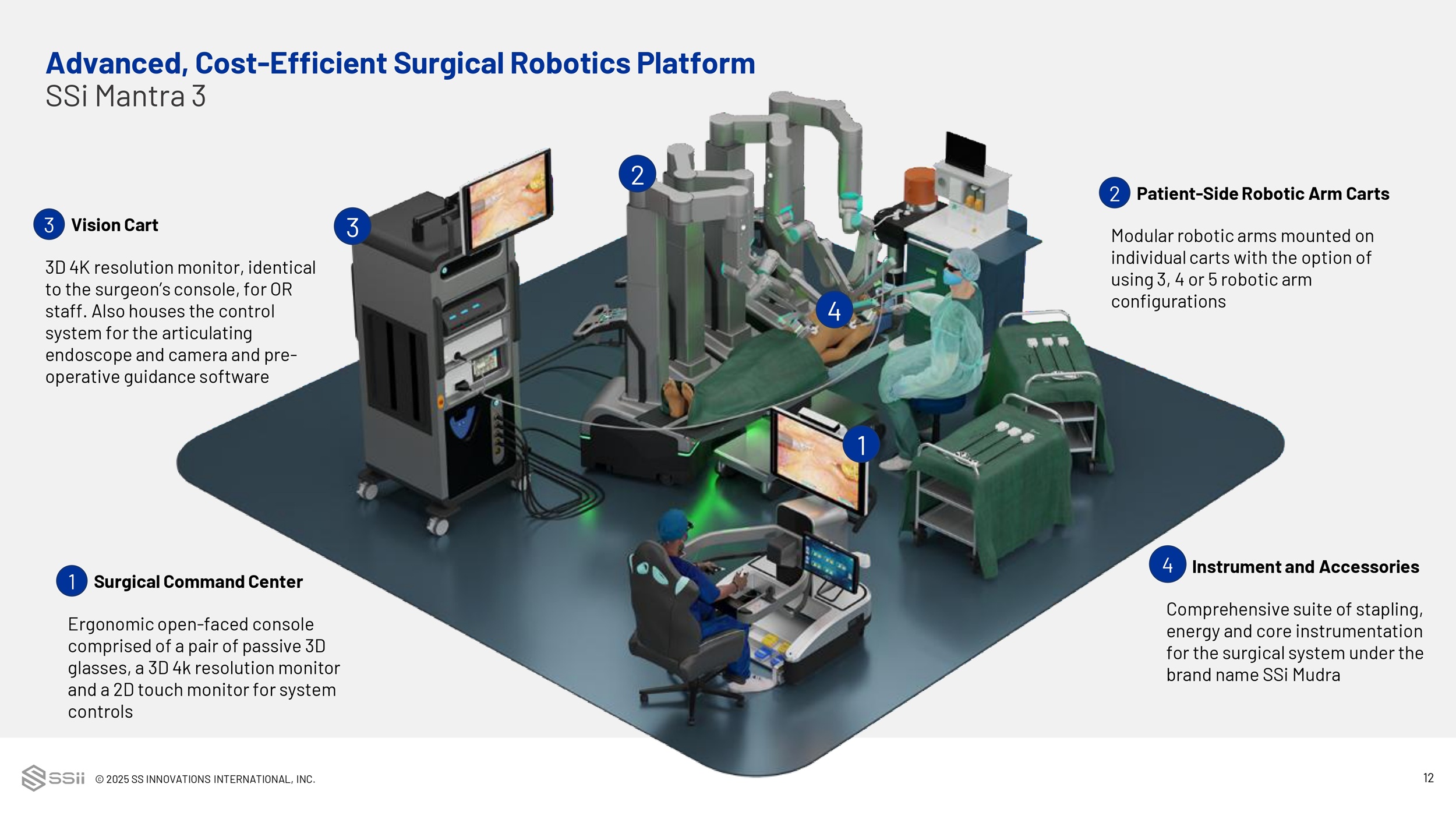 © 2025 SS INNOVATIONS INTERNATIONAL, INC. 11 ~ 70,000 Hospitals 1.6 Hospital Beds per 1,000 people (compared to the recommended 3) 1 Estimated need of 5,000 surgeries per year per 100,000 people 2 ~1.4 Billion Population 127 4 Surgical Robotic Systems are SSi Mantra 6,000+ 4 Robot Assisted Surgeries performed in India on the SSi Mantra Estimated 1,400+ 4 Robotic Surgeons trained on the SSi Mantra Notes: 1 Sourced from 2020 BIS Global Surgical Robotics Market Report 2 Sourced from 2015 Lancet Global Health report 3 Sourced from public company materials 4 Data as of September 30, 2025 800 robotic - assisted trained surgeons and >100 da Vinci robotic - assisted surgical systems installed across major private and government hospitals 3 >100,000 da Vinci procedures performed 3 Surgical robotics market was valued at $851mm in 2023 and is anticipated to reach almost $4bn by 2031 1 Large and Growing Addressable Market with Favorable Industry Tailwinds Unmet Needs and Market Opportunity Support Our Foundational Market in India