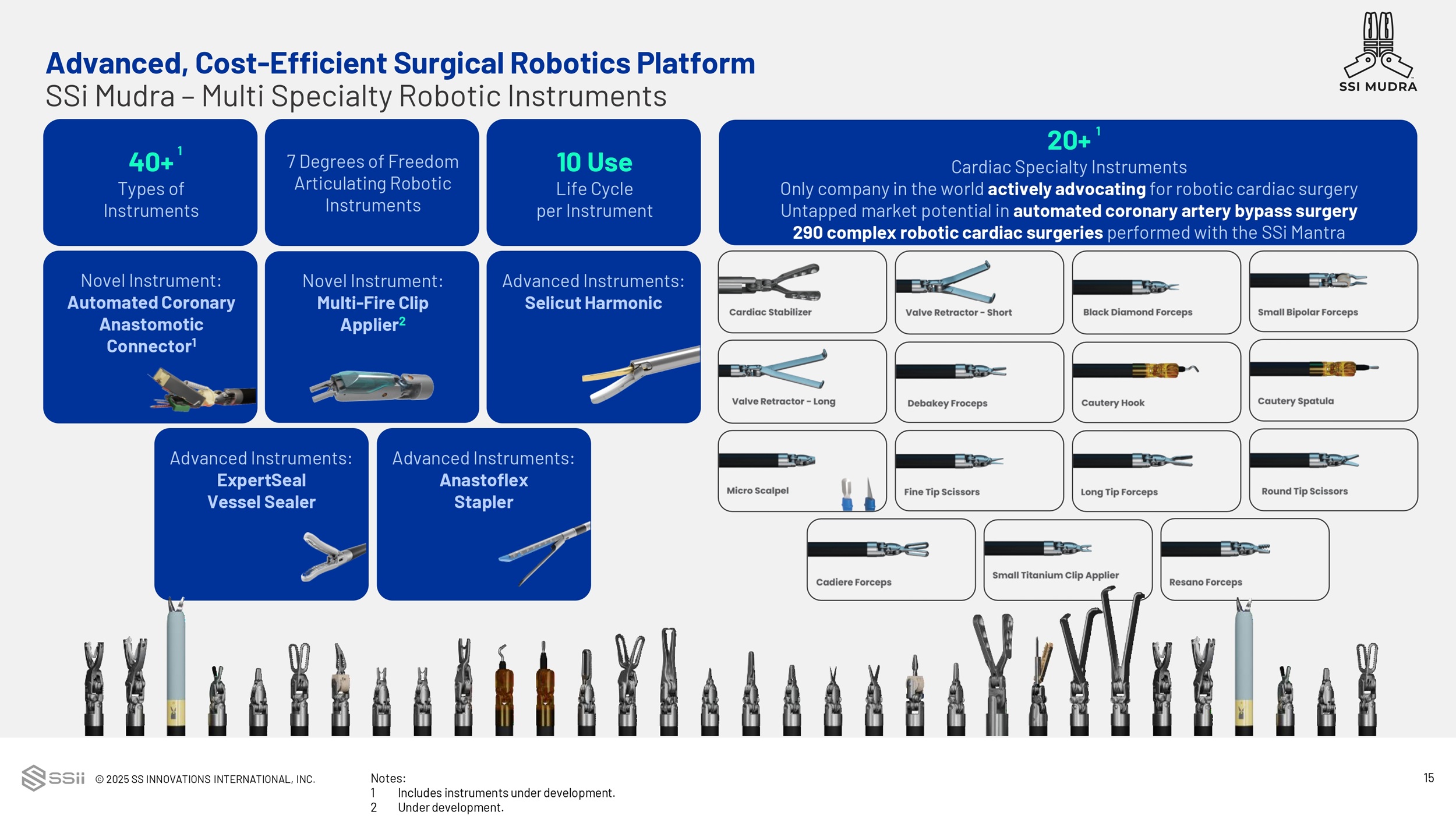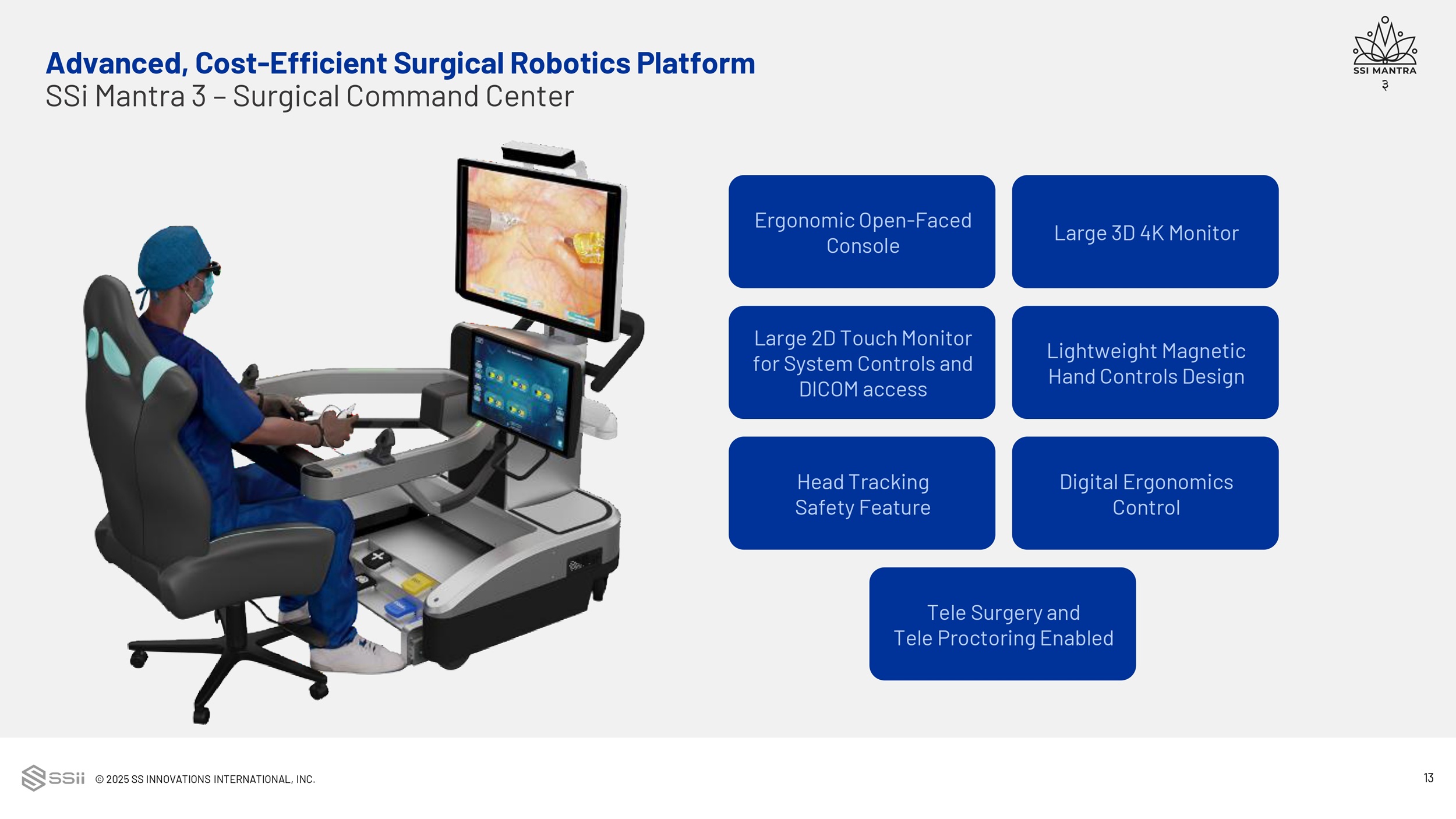 © 2025 SS INNOVATIONS INTERNATIONAL, INC. 12 Advanced, Cost - Efficient Surgical Robotics Platform SSi Mantra 3 1 2 3 1 Surgical Command Center Ergonomic open - faced console comprised of a pair of passive 3D glasses, a 3D 4k resolution monitor and a 2D touch monitor for system controls 2 Patient - Side Robotic Arm Carts Modular robotic arms mounted on individual carts with the option of using 3, 4 or 5 robotic arm configurations 3 Vision Cart 3D 4K resolution monitor, identical to the surgeon’s console, for OR staff. Also houses the control system for the articulating endoscope and camera and pre - operative guidance software 4 Instrument and Accessories Comprehensive suite of stapling, energy and core instrumentation for the surgical system under the brand name SSi Mudra 4