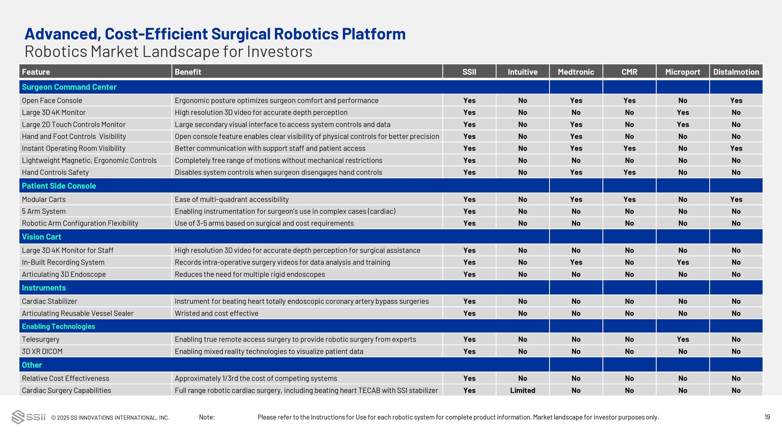 © 2025 SS INNOVATIONS INTERNATIONAL, INC. 19 Distalmotion Microport CMR Medtronic Intuitive SSII Benefit Feature Surgeon Command Center Yes No Yes Yes No Yes Ergonomic posture optimizes surgeon comfort and performance Open Face Console No Yes No No No Yes High resolution 3D video for accurate depth perception Large 3D 4K Monitor No Yes No Yes No Yes Large secondary visual interface to access system controls and data Large 2D Touch Controls Monitor No No No Yes No Yes Open console feature enables clear visibility of physical controls for better precision Hand and Foot Controls Visibility Yes No Yes Yes No Yes Better communication with support staff and patient access Instant Operating Room Visibility No No No No No Yes Completely free range of motions without mechanical restrictions Lightweight Magnetic, Ergonomic Controls No No Yes Yes No Yes Disables system controls when surgeon disengages hand controls Hand Controls Safety Patient Side Console Yes No Yes Yes No Yes Ease of multi - quadrant accessibility Modular Carts No No No No No Yes Enabling instrumentation for surgeon’s use in complex cases (cardiac) 5 Arm System No No No No No Yes Use of 3 - 5 arms based on surgical and cost requirements Robotic Arm Configuration Flexibility Vision Cart No No No No No Yes High resolution 3D video for accurate depth perception for surgical assistance Large 3D 4K Monitor for Staff No Yes No Yes No Yes Records intra - operative surgery videos for data analysis and training In - Built Recording System No No No No No Yes Reduces the need for multiple rigid endoscopes Articulating 3D Endoscope Instruments No No No No No Yes Instrument for beating heart totally endoscopic coronary artery bypass surgeries Cardiac Stabilizer No No No No No Yes Wristed and cost effective Articulating Reusable Vessel Sealer Enabling Technologies No Yes No No No Yes Enabling true remote access surgery to provide robotic surgery from experts Telesurgery No No No No No Yes Enabling mixed reality technologies to visualize patient data 3D XR DICOM Other No No No No No Yes Approximately 1/3rd the cost of competing systems Relative Cost Effectiveness No No No No Limited Yes Full range robotic cardiac surgery, including beating heart TECAB with SSI stabilizer Cardiac Surgery Capabilities Note: Please refer to the Instructions for Use for each robotic system for complete product information. Market landscape for in vestor purposes only. Advanced, Cost - Efficient Surgical Robotics Platform Robotics Market Landscape for Investors