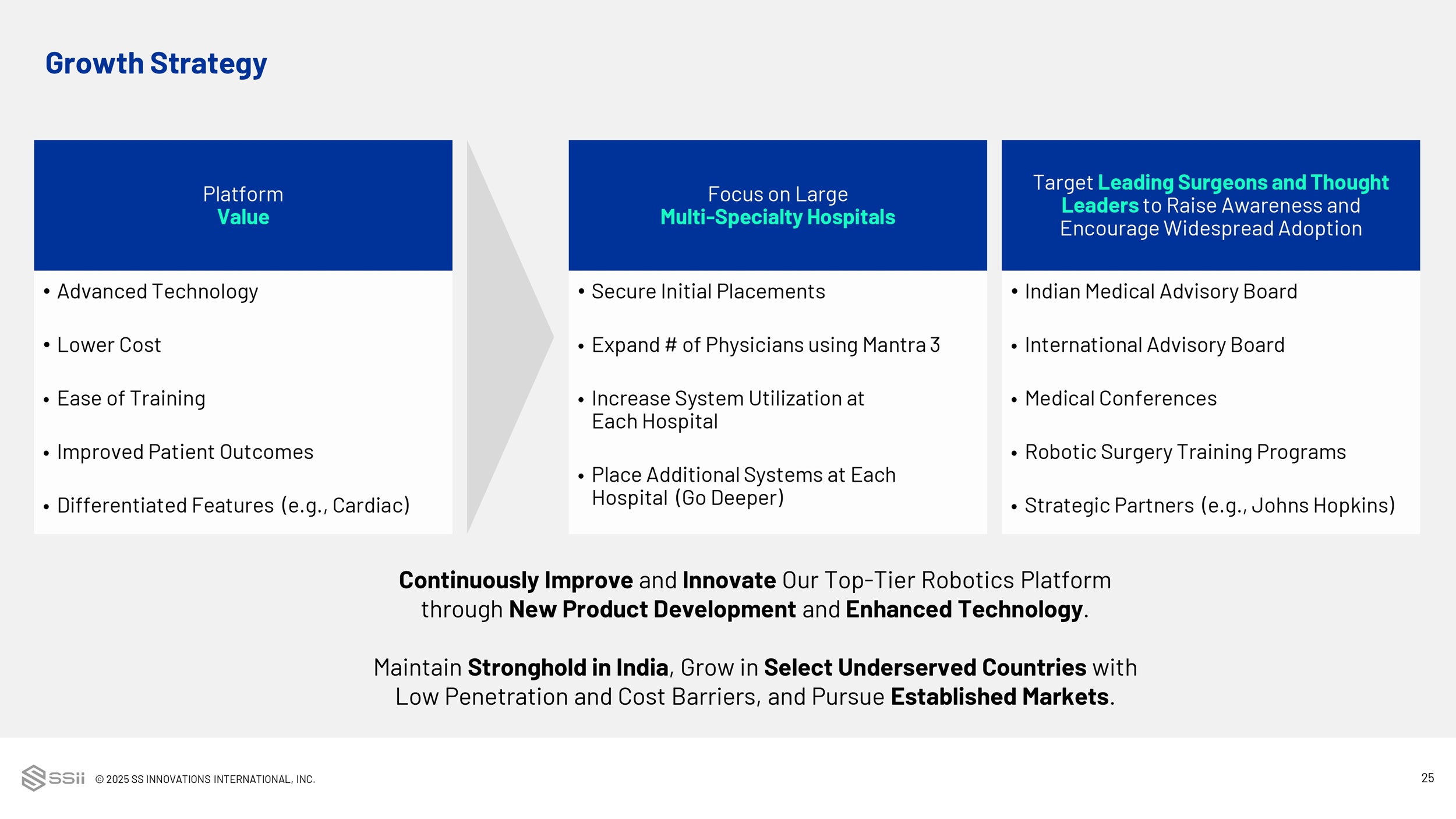 © 2025 SS INNOVATIONS INTERNATIONAL, INC. 25 Growth Strategy Continuously Improve and Innovate Our Top - Tier Robotics Platform through New Product Development and Enhanced Technology . Maintain Stronghold in India , Grow in Select Underserved Countries with Low Penetration and Cost Barriers, and Pursue Established Markets . Focus on Large Multi - Specialty Hospitals • Secure Initial Placements • Expand # of Physicians using Mantra 3 • Increase System Utilization at Each Hospital • Place Additional Systems at Each Hospital (Go Deeper) Target Leading Surgeons and Thought Leaders to Raise Awareness and Encourage Widespread Adoption • Indian Medical Advisory Board • International Advisory Board • Medical Conferences • Robotic Surgery Training Programs • Strategic Partners (e.g., Johns Hopkins) Platform Value • Advanced Technology • Lower Cost • Ease of Training • Improved Patient Outcomes • Differentiated Features (e.g., Cardiac)