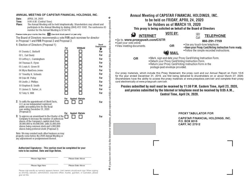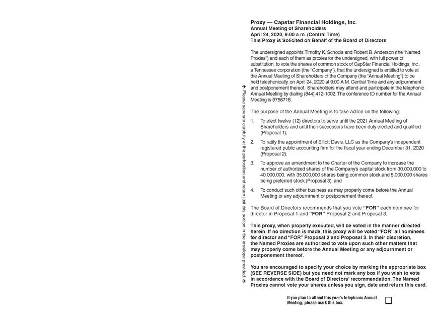 Proxy — Capstar Financial Holdings, Inc. Annual Meeting of Shareholders April 24, 2020, 9:00 a.m. (Central Time) This Proxy is Solicited on Behalf of the Board of Directors The undersigned appoints Timothy K. Schools and Robert B. Anderson (the “Named Proxies”) and each of them as proxies for the undersigned, with full power of substitution, to vote the shares of common stock of CapStar Financial Holdings, Inc., a Tennessee corporation (the “Company”), that the undersigned is entitled to vote at the Annual Meeting of Shareholders of the Company (the “Annual Meeting”) to be held telephonically, on April 24, 2020 at 9:00 A.M. Central Time and any adjournment and postponement thereof. Shareholders may attend and participate in the telephonic Annual Meeting by dialing (844) 412-1002. The conference ID number for the Annual Meeting is 9756718. The purpose of the Annual Meeting is to take action on the following: 1. To elect twelve (12) directors to serve until the 2021 Annual Meeting of Shareholders and until their successors have been duly elected and qualified (Proposal 1); 2. To ratify the appointment of Elliott Davis, LLC as the Company’s independent registered public accounting firm for the fiscal year ending December 31, 2020 (Proposal 2); 3. To approve an amendment to the Charter of the Company to increase the number of authorized shares of the Company’s capital stock from 30,000,000 to 40,000,000, with 35,000,000 shares being common stock and 5,000,000 shares being preferred stock (Proposal 3); and 4. To conduct such other business as may properly come before the Annual Meeting or any adjournment or postponement thereof. The Board of Directors recommends that you vote “FOR” each nominee for director in Proposal 1 and “FOR” Proposal 2 and Proposal 3. This proxy, when properly executed, will be voted in the manner directed herein. If no direction is made, this proxy will be voted “FOR” all nominees for director and “FOR” Proposal 2 and Proposal 3. In their discretion, the Named Proxies are authorized to vote upon such other matters that may properly come before the Annual Meeting or any adjournment or postponement thereof. You are encouraged to specify your choice by marking the appropriate box (SEE REVERSE SIDE) but you need not mark any box if you wish to vote in accordance with the Board of Directors’ recommendation. The Named Proxies cannot vote your shares unless you sign, date and return this card. Please separate carefully at the perforation and return just this portion in the envelope provided. If you plan to attend this year’s telephonic Annual Meeting, please mark this box.