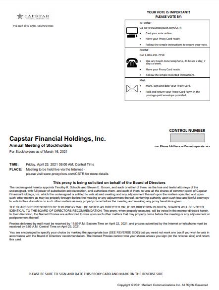 P.O. BOX 8016, CARY, NC 27512-9903 YOUR VOTE IS IMPORTANT! PLEASE VOTE BY: INTERNET Go To: www.proxypush.com/CSTR Cast your vote online Have your Proxy Card ready. Follow the simple instructions to record your vote. PHONE Call 1-866-291-7759 Use any touch-tone telephone, 24 hours a day, 7 days a week. Have your Proxy Card ready. Follow the simple recorded instructions. MAIL Mark, sign and date your Proxy Card. Fold and return your Proxy Card Form in the postage-paid envelope provided. CONTROL NUMBER Please fold here Do not separate Capstar Financial Holdings, Inc. Annual Meeting of Stockholders For Stockholders as of March 16, 2021 TIME: Friday, April 23, 2021 09:00 AM, Central Time PLACE: Meeting to be held live via the Internet - please visit www.proxydocs.com/CSTR for more details This proxy is being solicited on behalf of the Board of Directors The undersigned hereby appoints Timothy K. Schools and Steven E. Groom, and each or either of them, as the true and lawful attorneys of the undersigned, with full power of substitution and revocation, and authorizes them, and each of them, to vote all the shares of common stock of Capstar Financial Holdings, Inc. which the undersigned is entitled to vote at said meeting and any adjournment thereof upon the matters specified and upon such other matters as may be properly brought before the meeting or any adjournment thereof, conferring authority upon such true and lawful attorneys to vote in their discretion on such other matters as may properly come before the meeting and revoking any proxy heretofore given. THE SHARES REPRESENTED BY THIS PROXY WILL BE VOTED AS DIRECTED OR, IF NO DIRECTION IS GIVEN, SHARES WILL BE VOTED IDENTICAL TO THE BOARD OF DIRECTORS RECOMMENDATION. This proxy, when properly executed, will be voted in the manner directed herein. In their discretion, the Named Proxies are authorized to vote upon such other matters that may properly come before the meeting or any adjournment or postponement thereof. Proxies delivered by mail must be received by 11:59 P.M. Eastern Time on April 22, 2021, and proxies submitted by the Internet or telephone must be received by 9:05 A.M. Central Time on April 23, 2021. You are encouraged to specify your choice by marking the appropriate box (SEE REVERSE SIDE) but you need not mark any box if you wish to vote in accordance with the Board of Directors’ recommendation. The Named Proxies cannot vote your shares unless you sign (on the reverse side) and return this card. PLEASE BE SURE TO SIGN AND DATE THIS PROXY CARD AND MARK ON THE REVERSE SIDE Copyright © 2021 Mediant Communications Inc. All Rights Reserved