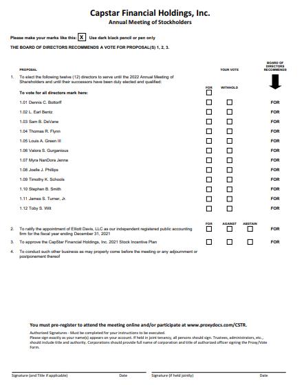 Capstar Financial Holdings, Inc. Annual Meeting of Stockholders Please make your marks like this: X Use dark black pencil or pen only THE BOARD OF DIRECTORS RECOMMENDS A VOTE FOR PROPOSAL(S) 1, 2, 3. PROPOSAL YOUR VOTE BOARD OF DIRECTORS RECOMMENDS 1. To elect the following twelve (12) directors to serve until the 2022 Annual Meeting of Shareholders and until their successors have been duly elected and qualified: FOR WITHHOLD To vote for all directors mark here: #P1# 1.01 Dennis C. Bottorff #P2# #P2# FOR 1.02 L. Earl Bentz #P3# #P3# FOR 1.03 Sam B. DeVane #P4# #P4# FOR 1.04 Thomas R. Flynn #P5# #P5# FOR 1.05 Louis A. Green III #P6# #P6# FOR 1.06 Valora S. Gurganious #P7# #P7# FOR 1.07 Myra NanDora Jenne #P8# #P8# FOR 1.08 Joelle J. Phillips #P9# #P9# FOR 1.09 Timothy K. Schools #P10# #P10# FOR 1.10 Stephen B. Smith #P11# #P11# FOR 1.11 James S. Turner, Jr. #P12# #P12# FOR 1.12 Toby S. Wilt #P13# #P13# FOR 2. To ratify the appointment of Elliott Davis, LLC as our independent registered public accounting firm for the fiscal year ending December 31, 2021 #P14# #P14# #P14# FOR 3. To approve the CapStar Financial Holdings, Inc. 2021 Stock Incentive Plan #P15# #P15# #P15# FOR 4. To conduct such other business as may properly come before the meeting or any adjournment or postponement thereof FOR AGAINST ABSTAIN You must pre-register to attend the meeting online and/or participate at www.proxydocs.com/CSTR. Authorized Signatures - Must be completed for your instructions to be executed. Please sign exactly as your name(s) appears on your account. If held in joint tenancy, all persons should sign. Trustees, administrators, etc., should include title and authority. Corporations should provide full name of corporation and title of authorized officer signing the Proxy/Vote Form. Signature (and Title if applicable) Proposal_Page - VIFL Date Signature (if held jointly) Date