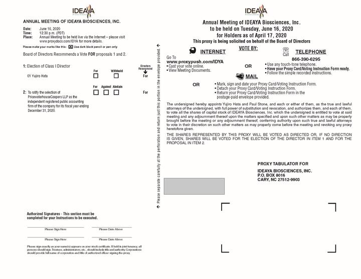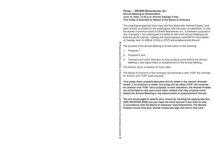 ANNUAL MEETING OF IDEAYA BIOSCIENCES, INC. Annual Meeting of IDEAYA Biosciences, Inc. to be held on Tuesday, June 16, 2020 for Holders as of April 17, 2020 This proxy is being solicited on behalf of the Board of Directors Date: June 16, 2020 Time: 12:30 p.m. (PDT) Place: Annual Meeting to be held live via the Internet – please visit www.proxydocs.com/IDYA for more details. Please separate carefully at the perforation and return just this portion in the envelope provided. Please make your marks like this: Use dark black pencil or pen only VOTE BY: INTERNET TELEPHONE Board of Directors Recommends a Vote FOR proposals 1 and 2. Call Go To www.proxypush.com/IDYA • Cast your vote online. • View Meeting Documents. 866-390-6295 • Use any touch-tone telephone. • Have your Proxy Card/Voting Instruction Form ready. • Follow the simple recorded instructions. OR 1: Election of Class I Director Directors Recommend Withhold For 01 Yujiro Hata For MAIL • Mark, sign and date your Proxy Card/Voting Instruction Form. • Detach your Proxy Card/Voting Instruction Form. • Return your Proxy Card/Voting Instruction Form in the postage-paid envelope provided. OR For Against Abstain 2: To ratify the selection of PricewaterhouseCoopers LLP as the independent registered public accounting firm of the company for its fiscal year ending December 31, 2020. For The undersigned hereby appoints Yujiro Hata and Paul Stone, and each or either of them, as the true and lawful attorneys of the undersigned, with full power of substitution and revocation, and authorizes them, and each of them, to vote all the shares of capital stock of IDEAYA Biosciences, Inc. which the undersigned is entitled to vote at said meeting and any adjournment thereof upon the matters specified and upon such other matters as may be properly brought before the meeting or any adjournment thereof, conferring authority upon such true and lawful attorneys to vote in their discretion on such other matters as may properly come before the meeting and revoking any proxy heretofore given. THE SHARES REPRESENTED BY THIS PROXY WILL BE VOTED AS DIRECTED OR, IF NO DIRECTION IS GIVEN, SHARES WILL BE VOTED FOR THE ELECTION OF THE DIRECTOR IN ITEM 1 AND FOR THE PROPOSAL IN ITEM 2. PROXY TABULATOR FOR IDEAYA BIOSCIENCES, INC. P.O. BOX 8016 CARY, NC 27512-9903 Authorized Signatures - This section must be completed for your Instructions to be executed. Please Sign Here Please Date Above Please Sign Here Please Date Above Please sign exactly as your name(s) appears on your stock certificate. If held in joint tenancy, all persons should sign. Trustees, administrators, etc., should include title and authority. Corporations should provide full name of corporation and title of authorized officer signing the proxy. Proxy — IDEAYA Biosciences, Inc. Annual Meeting of Stockholders June 16, 2020, 12:30 p.m. (Pacific Daylight Time) This Proxy is Solicited on Behalf of the Board of Directors The undersigned appoints Yujiro Hata and Paul Stone (the “Named Proxies”) and each of them as proxies for the undersigned, with full power of substitution, to vote the shares of common stock of IDEAYA Biosciences, Inc., a Delaware corporation (the “Company”), the undersigned is entitled to vote at the Annual Meeting to be held live via the Internet – please visit www.proxydocs.com/IDYA for more details, on Tuesday, June 16, 2020 at 12:30 p.m. (PDT) and all adjournments thereof. The purpose of the Annual Meeting is to take action on the following: 1. Proposal 1; 2. Proposal 2; and 3. Transact such other business as may properly come before the Annual Meeting or any adjournment or postponement of the Annual Meeting. The director up for re-election is: Yujiro Hata. The Board of Directors of the Company recommends a vote “FOR” the nominee for director and “FOR” each proposal. This proxy, when properly executed, will be voted in the manner directed herein. If no direction is made, this proxy will be voted “FOR” the nominee for director and “FOR” each proposal. In their discretion, the Named Proxies are authorized to vote upon such other matters that may properly come before the Annual Meeting or any adjournment or postponement thereof. You are encouraged to specify your choice by marking the appropriate box (SEE REVERSE SIDE) but you need not mark any box if you wish to vote in accordance with the Board of Directors’ recommendation. The Named Proxies cannot vote your shares unless you sign and return this card. Please separate carefully at the perforation and return just this portion in the envelope provided.