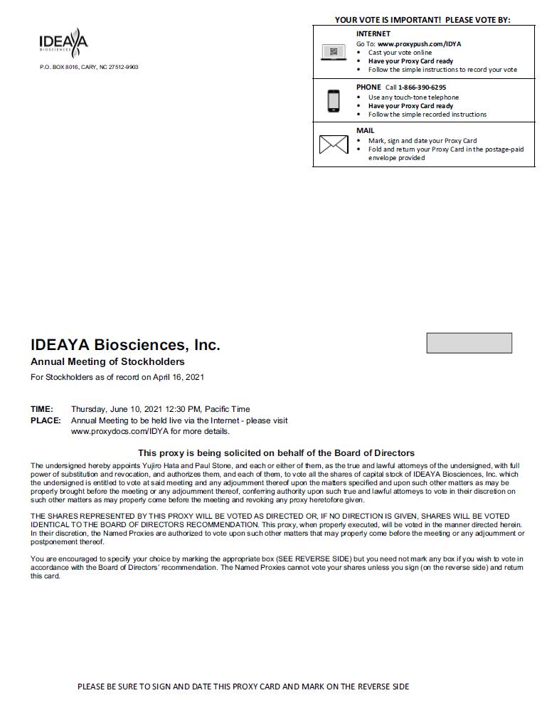 IDEAYA LOGO P.O. BOX 8016, CARY, NC 27512-9903 YOUR VOTE IS IMPORTANT! PLEASE VOTE BY: INTERNET Go To: www.proxypush.com/IDYA Cast your vote online Have your Proxy Card ready Follow the simple instructions to record your vote PHONE Call 1-866-390-6295 Use any touch-tone telephone Have your Proxy Card ready Follow the simple recorded instructions MAIL Mark, sign and date your Proxy Card Fold and return your Proxy Card in the postage-paid envelope provided IDEAYA Biosciences, Inc. Annual Meeting of Stockholders For Stockholders as of record on April 16, 2021 TIME: Thursday, June 10, 2021 12:30 PM, Pacific Time PLACE: Annual Meeting to be held live via the Internet - please visit www.proxydocs.com/IDYA for more details. This proxy is being solicited on behalf of the Board of Directors The undersigned hereby appoints Yujiro Hata and Paul Stone, and each or either of them, as the true and lawful attorneys of the undersigned, with full power of substitution and revocation, and authorizes them, and each of them, to vote all the shares of capital stock of IDEAYA Biosciences, Inc. which the undersigned is entitled to vote at said meeting and any adjournment thereof upon the matters specified and upon such other matters as may be properly brought before the meeting or any adjournment thereof, conferring authority upon such true and lawful attorneys to vote in their discretion on such other matters as may properly come before the meeting and revoking any proxy heretofore given. THE SHARES REPRESENTED BY THIS PROXY WILL BE VOTED AS DIRECTED OR, IF NO DIRECTION IS GIVEN, SHARES WILL BE VOTED IDENTICAL TO THE BOARD OF DIRECTORS RECOMMENDATION. This proxy, when properly executed, will be voted in the manner directed herein. In their discretion, the Named Proxies are authorized to vote upon such other matters that may properly come before the meeting or any adjournment or postponement thereof. You are encouraged to specify your choice by marking the appropriate box (SEE REVERSE SIDE) but you need not mark any box if you wish to vote in accordance with the Board of Directors’ recommendation. The Named Proxies cannot vote your shares unless you sign (on the reverse side) and return this card. PLEASE BE SURE TO SIGN AND DATE THIS PROXY CARD AND MARK ON THE REVERSE SIDE
