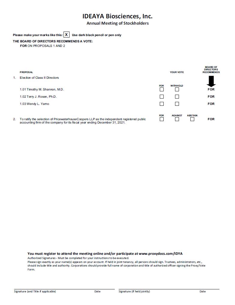 IDEAYA Biosciences, Inc. Annual Meeting of Stockholders Please make your marks like this: X Use dark black pencil or pen only THE BOARD OF DIRECTORS RECOMMENDS A VOTE: FOR ON PROPOSALS 1 AND 2 PROPOSAL YOUR VOTE BOARD OF DIRECTORS RECOMMENDS 1. Election of Class II Directors FOR WITHHOLD 1.01 Timothy M. Shannon, M.D. FOR 1.02 Terry J. Rosen, Ph.D. FOR 1.03 Wendy L. Yarno FOR FOR AGAINST ABSTAIN FOR 2. To ratify the selection of PricewaterhouseCoopers LLP as the independent registered public accounting firm of the company for its fiscal year ending December 31, 2021. You must register to attend the meeting online and/or participate at www.proxydocs.com/IDYA Authorized Signatures - Must be completed for your instructions to be executed. Please sign exactly as your name(s) appears on your account. If held in joint tenancy, all persons should sign. Trustees, administrators, etc., should include title and authority. Corporations should provide full name of corporation and title of authorized officer signing the Proxy/Vote Form. Signature (and Title if applicable) Date Signature (if held jointly) Date