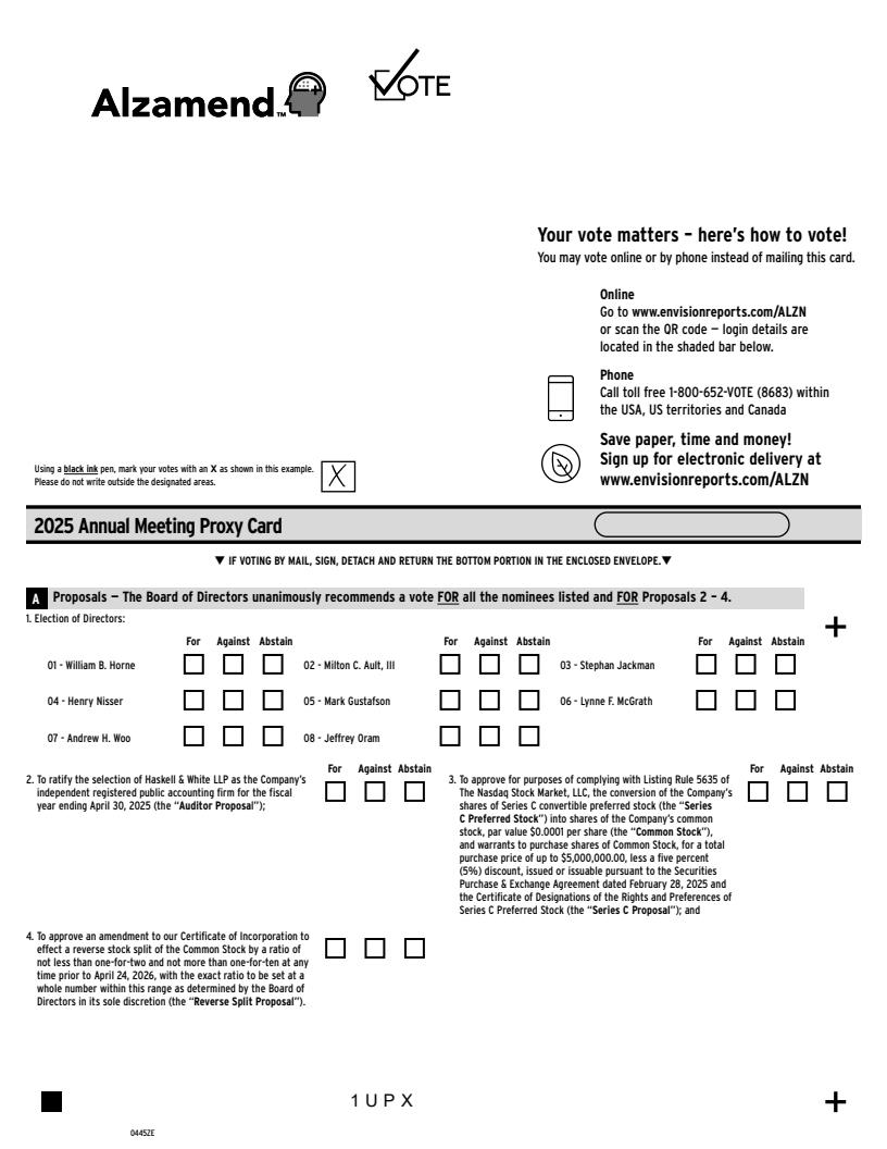 01 - William B. Horne 04 - Henry Nisser07 - Andrew H. Woo02 - Milton C. Ault, III05 - Mark Gustafson08 - Jeffrey Oram 03 - Stephan Jackman06 - Lynne F. McGrath1UPXForAgainstAbstainForAgainstAbstainForAgainstAbstainProposals ? The Board of Directors unanimously recommends a vote FOR all the nominees listed and FOR Proposals 2 ? 4.A0445ZE2. To ratify the selection of Haskell & White LLP as the Company's independent registered public accounting firm for the fiscal year ending April 30, 2025 (the "Auditor Proposal");3. To approve for purposes of complying with Listing Rule 5635 of The Nasdaq Stock Market, LLC, the conversion of the Company's shares of Series C convertible preferred stock (the "Series C Preferred Stock") into shares of the Company's common stock, par value $0.0001 per share (the "Common Stock"), and warrants to purchase shares of Common Stock, for a total purchase price of up to $5,000,000.00, less a five percent (5%) discount, issued or issuable pursuant to the Securities Purchase & Exchange Agreement dated February 28, 2025 and the Certificate of Designations of the Rights and Preferences of Series C Preferred Stock (the "Series C Proposal"); and1. Election of Directors:ForAgainstAbstainForAgainstAbstain4. To approve an amendment to our Certificate of Incorporation to effect a reverse stock split of the Common Stock by a ratio of not less than one-for-two and not more than one-for-ten at any time prior to April 24, 2026, with the exact ratio to be set at a whole number within this range as determined by the Board of Directors in its sole discretion (the "Reverse Split Proposal").2025 Annual Meeting Proxy CardUsing a black ink pen, mark your votes with an X as shown in this example. Please do not write outside the designated areas.qIF VOTING BY MAIL, SIGN, DETACH AND RETURN THE BOTTOM PORTION IN THE ENCLOSED ENVELOPE.qYou may vote online or by phone instead of mailing this card.OnlineGo to www.envisionreports.com/ALZN or scan the QR code ? login details are located in the shaded bar below.Your vote matters ? here's how to vote!Save paper, time and money! Sign up for electronic delivery at www.envisionreports.com/ALZNPhoneCall toll free 1-800-652-VOTE (8683) within the USA, US territories and Canada