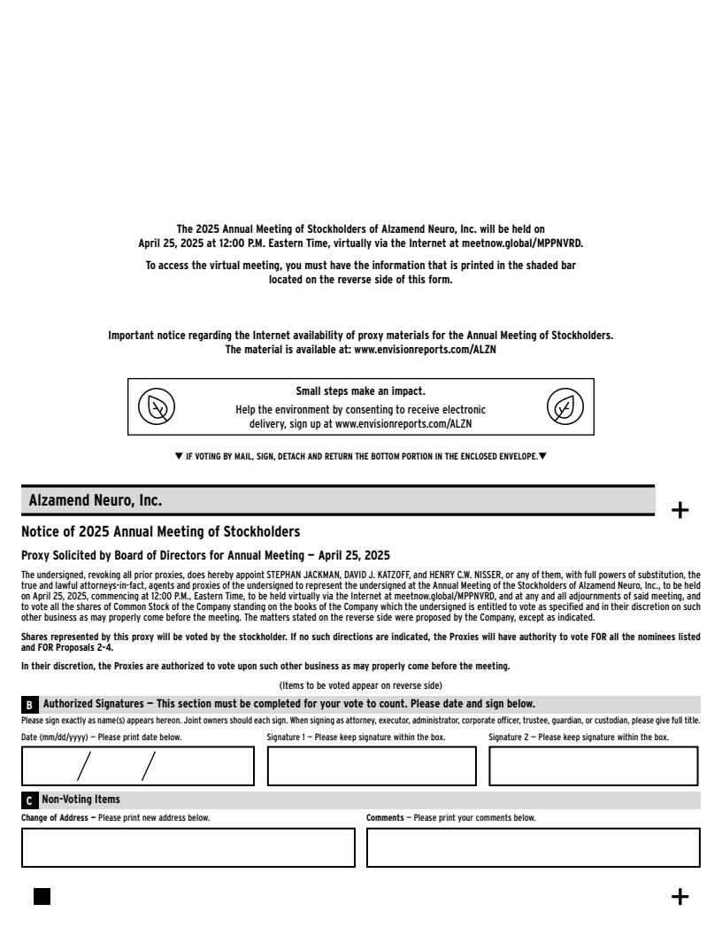 Small steps make an impact.Help the environment by consenting to receive electronic delivery, sign up at www.envisionreports.com/ALZNNotice of 2025 Annual Meeting of StockholdersProxy Solicited by Board of Directors for Annual Meeting ? April 25, 2025The undersigned, revoking all prior proxies, does hereby appoint STEPHAN JACKMAN, DAVID J. KATZOFF, and HENRY C.W. NISSER, or any of them, with full powers of substitution, the true and lawful attorneys-in-fact, agents and proxies of the undersigned to represent the undersigned at the Annual Meeting of the Stockholders of Alzamend Neuro, Inc., to be held on April 25, 2025, commencing at 12:00 P.M., Eastern Time, to be held virtually via the Internet at meetnow.global/MPPNVRD, and at any and all adjournments of said meeting, and to vote all the shares of Common Stock of the Company standing on the books of the Company which the undersigned is entitled to vote as specified and in their discretion on such other business as may properly come before the meeting. The matters stated on the reverse side were proposed by the Company, except as indicated. Shares represented by this proxy will be voted by the stockholder. If no such directions are indicated, the Proxies will have authority to vote FOR all the nominees listed and FOR Proposals 2-4.In their discretion, the Proxies are authorized to vote upon such other business as may properly come before the meeting.(Items to be voted appear on reverse side)Alzamend Neuro, Inc.Non-Voting ItemsCqIF VOTING BY MAIL, SIGN, DETACH AND RETURN THE BOTTOM PORTION IN THE ENCLOSED ENVELOPE.qChange of Address ? Please print new address below.Comments ? Please print your comments below.Please sign exactly as name(s) appears hereon. Joint owners should each sign. When signing as attorney, executor, administrator, corporate officer, trustee, guardian, or custodian, please give full title.Signature 1 ? Please keep signature within the box.Signature 2 ? Please keep signature within the box.Date (mm/dd/yyyy) ? Please print date below.Authorized Signatures ? This section must be completed for your vote to count. Please date and sign below.BImportant notice regarding the Internet availability of proxy materials for the Annual Meeting of Stockholders. The material is available at: www.envisionreports.com/ALZNThe 2025 Annual Meeting of Stockholders of Alzamend Neuro, Inc. will be held on April 25, 2025 at 12:00 P.M. Eastern Time, virtually via the Internet at meetnow.global/MPPNVRD.To access the virtual meeting, you must have the information that is printed in the shaded bar located on the reverse side of this form.