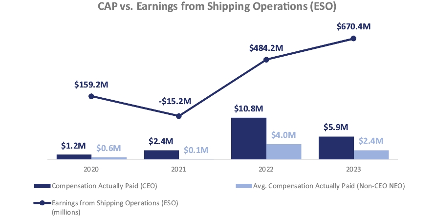 Year | | | Summary Compensation Table Total for PEO(1) | | | Compensation Actually Paid to PEO(2) | | | Average Summary Compensation Table Total for Non-PEO NEOs(3) | | | Average Compensation Actually Paid to Non-PEO NEOs(4) | | | Value of Initial Fixed $100 Investment Based On: | | | Net Income/(Loss) (millions) | | | Earnings from Shipping Operations (ESO) (millions)(6) | |||