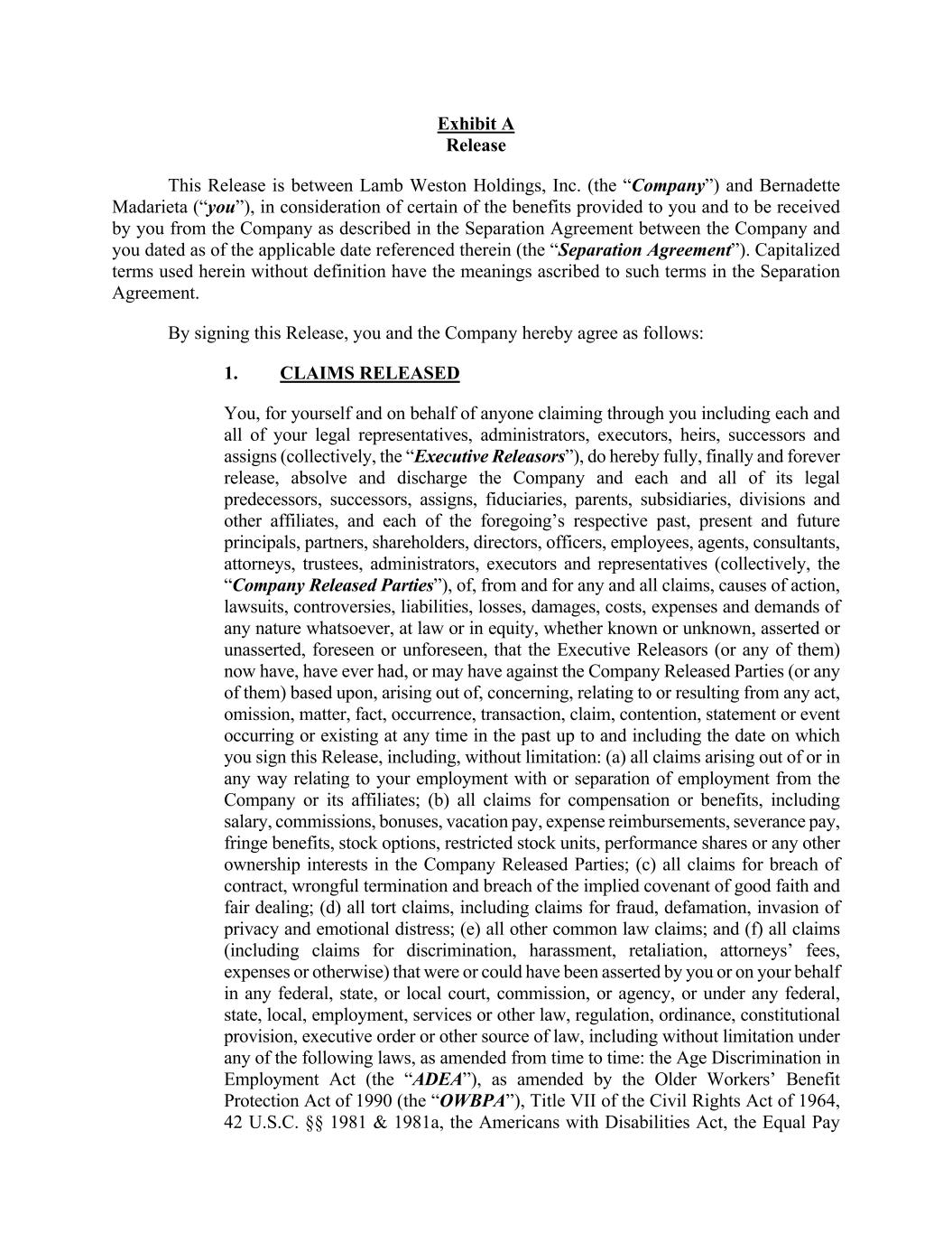 Exhibit A Release This Release is between Lamb Weston Holdings, Inc. (the “Company”) and Bernadette Madarieta (“you”), in consideration of certain of the benefits provided to you and to be received by you from the Company as described in the Separation Agreement between the Company and you dated as of the applicable date referenced therein (the “Separation Agreement”). Capitalized terms used herein without definition have the meanings ascribed to such terms in the Separation Agreement. By signing this Release, you and the Company hereby agree as follows: 1. CLAIMS RELEASED You, for yourself and on behalf of anyone claiming through you including each and all of your legal representatives, administrators, executors, heirs, successors and assigns (collectively, the “Executive Releasors”), do hereby fully, finally and forever release, absolve and discharge the Company and each and all of its legal predecessors, successors, assigns, fiduciaries, parents, subsidiaries, divisions and other affiliates, and each of the foregoing’s respective past, present and future principals, partners, shareholders, directors, officers, employees, agents, consultants, attorneys, trustees, administrators, executors and representatives (collectively, the “Company Released Parties”), of, from and for any and all claims, causes of action, lawsuits, controversies, liabilities, losses, damages, costs, expenses and demands of any nature whatsoever, at law or in equity, whether known or unknown, asserted or unasserted, foreseen or unforeseen, that the Executive Releasors (or any of them) now have, have ever had, or may have against the Company Released Parties (or any of them) based upon, arising out of, concerning, relating to or resulting from any act, omission, matter, fact, occurrence, transaction, claim, contention, statement or event occurring or existing at any time in the past up to and including the date on which you sign this Release, including, without limitation: (a) all claims arising out of or in any way relating to your employment with or separation of employment from the Company or its affiliates; (b) all claims for compensation or benefits, including salary, commissions, bonuses, vacation pay, expense reimbursements, severance pay, fringe benefits, stock options, restricted stock units, performance shares or any other ownership interests in the Company Released Parties; (c) all claims for breach of contract, wrongful termination and breach of the implied covenant of good faith and fair dealing; (d) all tort claims, including claims for fraud, defamation, invasion of privacy and emotional distress; (e) all other common law claims; and (f) all claims (including claims for discrimination, harassment, retaliation, attorneys’ fees, expenses or otherwise) that were or could have been asserted by you or on your behalf in any federal, state, or local court, commission, or agency, or under any federal, state, local, employment, services or other law, regulation, ordinance, constitutional provision, executive order or other source of law, including without limitation under any of the following laws, as amended from time to time: the Age Discrimination in Employment Act (the “ADEA”), as amended by the Older Workers’ Benefit Protection Act of 1990 (the “OWBPA”), Title VII of the Civil Rights Act of 1964, 42 U.S.C. §§ 1981 & 1981a, the Americans with Disabilities Act, the Equal Pay