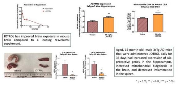 We believe that a high dose of resveratrol is needed for therapeutic effects. Currently available resveratrol products are associated with severe gastrointestinal (GI) side effects at the dose levels we believe are needed. Our belief is based on available scientific literature, preclinical trial results conducted in mice and rats, and previously conducted human trials with resveratrol. We believe that JOTROL, based on the results from our Phase I trial, see section “Description of Business”, has the potential to deliver a therapeutically effective dose of resveratrol in the blood stream without causing gastrointestinal (GI) side effects. Based on our pre-clinical and Phase I study results, we expect that JOTROL will resolve “the major obstacle of resveratrol’s poor bioavailability” as discussed in AY Berman’s summary article in the Journal of Precision Oncology (AY Berman, 2017). Based on our own preclinical studies we believe that resveratrol has the ability to cross the blood-brain barrier. Studies conducted in Friedreich’s ataxia (FA) and Alzheimer’s disease (AD) patients, resulted in positive effects on oxidative stress, inflammation, and mitochondrial function. The FA study was concluded in Australia by Murdoch Children’s Research Institute in 2015 (Yiu et al.). The AD study was conducted in 2015 by the Alzheimer’s Disease Cooperative Study with Professor Raymond Turner, MD, Ph.D., Georgetown, as principal investigator (Turner et al.). Both studies have been published in scientific journals and further described in the section “Description of Business”.