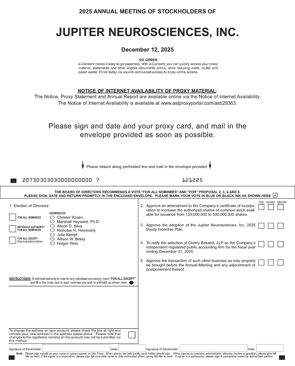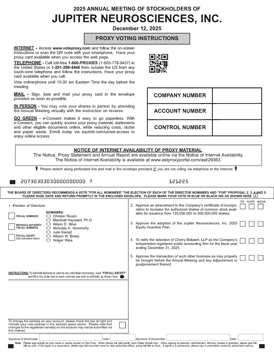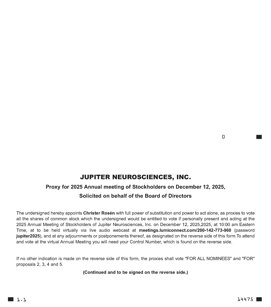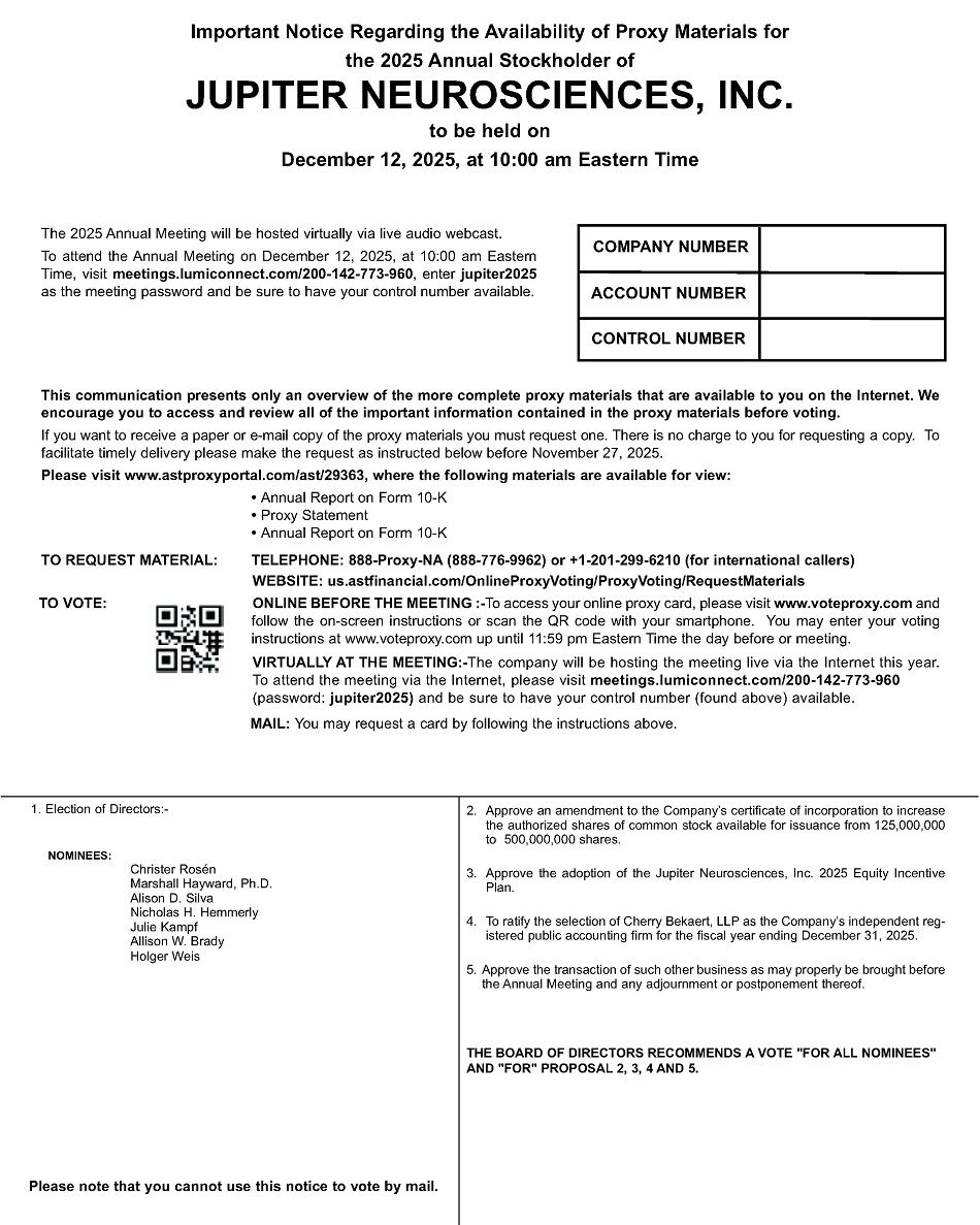 We invite you to attend the 2025 virtual Annual Meeting of Stockholders (the “Annual Meeting”) of Jupiter Neurosciences, Inc. (“Jupiter,” the “Company,” “us,” “our,” or “we”). The Annual Meeting will be held in a virtual meeting format on December 12, 2025 at 10:00 a.m. Eastern Time. You may attend, vote and submit questions during the Annual Meeting via the Internet at https://meetings.lumiconnect.com/200-142-773-960. We have designed the format of the Annual Meeting to ensure that you are afforded the same rights and opportunities to participate as you would at an in-person meeting, using online tools to ensure your access and participation.
