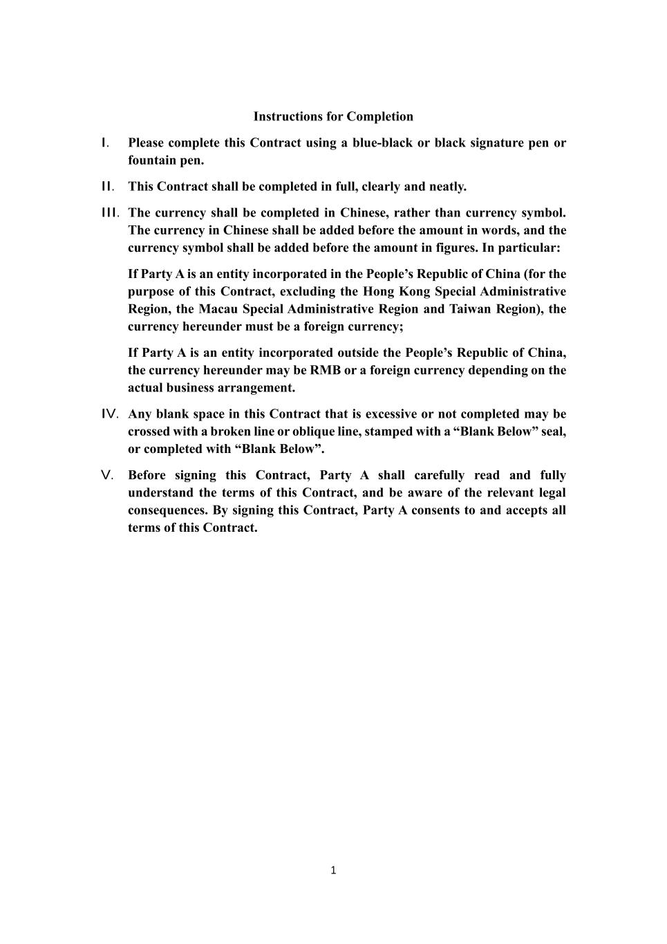 1 Instructions for Completion I. Please complete this Contract using a blue-black or black signature pen or fountain pen. II. This Contract shall be completed in full, clearly and neatly. III. The currency shall be completed in Chinese, rather than currency symbol. The currency in Chinese shall be added before the amount in words, and the currency symbol shall be added before the amount in figures. In particular: If Party A is an entity incorporated in the People’s Republic of China (for the purpose of this Contract, excluding the Hong Kong Special Administrative Region, the Macau Special Administrative Region and Taiwan Region), the currency hereunder must be a foreign currency; If Party A is an entity incorporated outside the People’s Republic of China, the currency hereunder may be RMB or a foreign currency depending on the actual business arrangement. IV. Any blank space in this Contract that is excessive or not completed may be crossed with a broken line or oblique line, stamped with a “Blank Below” seal, or completed with “Blank Below”. V. Before signing this Contract, Party A shall carefully read and fully understand the terms of this Contract, and be aware of the relevant legal consequences. By signing this Contract, Party A consents to and accepts all terms of this Contract.