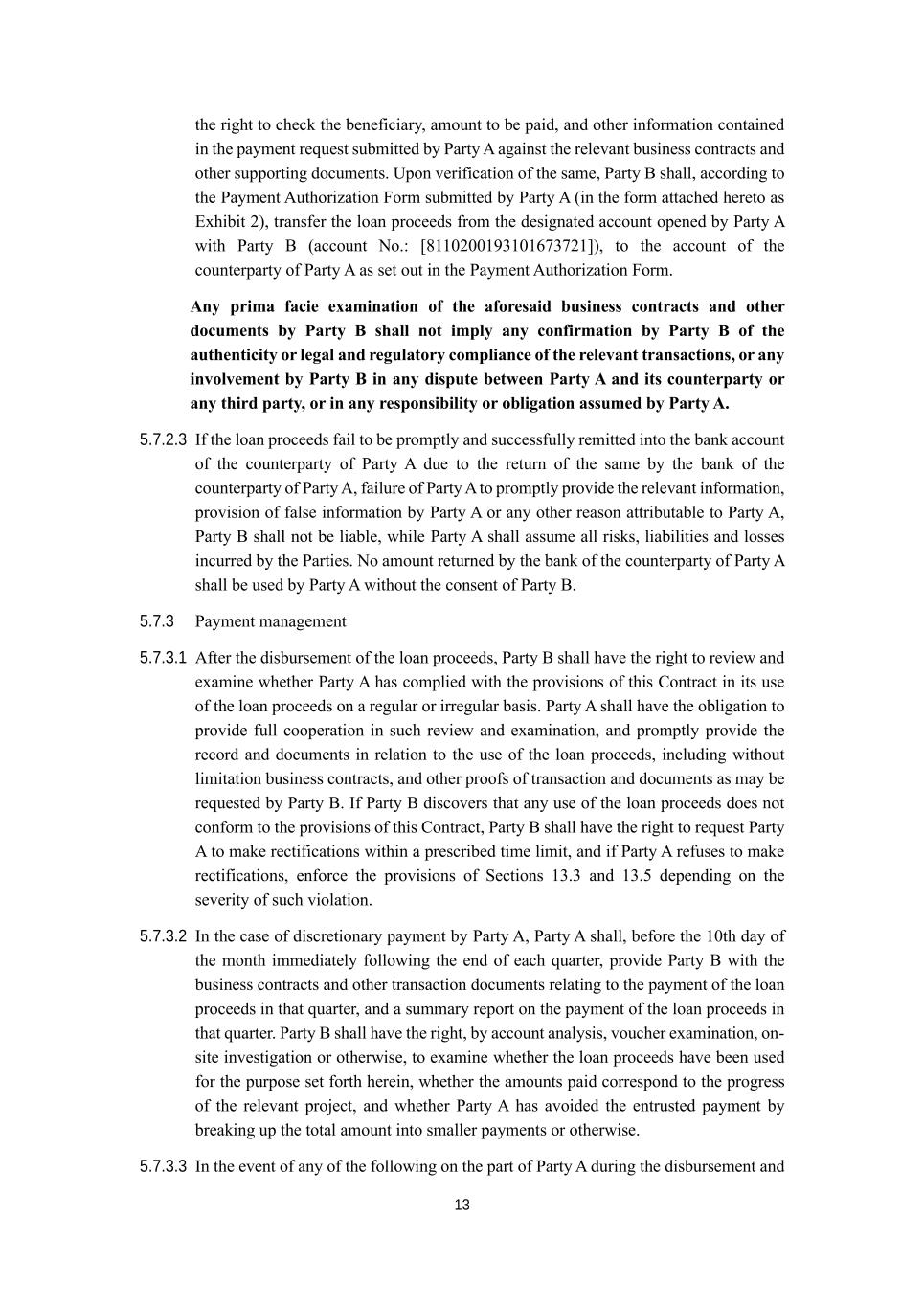 13 the right to check the beneficiary, amount to be paid, and other information contained in the payment request submitted by Party A against the relevant business contracts and other supporting documents. Upon verification of the same, Party B shall, according to the Payment Authorization Form submitted by Party A (in the form attached hereto as Exhibit 2), transfer the loan proceeds from the designated account opened by Party A with Party B (account No.: [8110200193101673721]), to the account of the counterparty of Party A as set out in the Payment Authorization Form. Any prima facie examination of the aforesaid business contracts and other documents by Party B shall not imply any confirmation by Party B of the authenticity or legal and regulatory compliance of the relevant transactions, or any involvement by Party B in any dispute between Party A and its counterparty or any third party, or in any responsibility or obligation assumed by Party A. 5.7.2.3 If the loan proceeds fail to be promptly and successfully remitted into the bank account of the counterparty of Party A due to the return of the same by the bank of the counterparty of Party A, failure of Party A to promptly provide the relevant information, provision of false information by Party A or any other reason attributable to Party A, Party B shall not be liable, while Party A shall assume all risks, liabilities and losses incurred by the Parties. No amount returned by the bank of the counterparty of Party A shall be used by Party A without the consent of Party B. 5.7.3 Payment management 5.7.3.1 After the disbursement of the loan proceeds, Party B shall have the right to review and examine whether Party A has complied with the provisions of this Contract in its use of the loan proceeds on a regular or irregular basis. Party A shall have the obligation to provide full cooperation in such review and examination, and promptly provide the record and documents in relation to the use of the loan proceeds, including without limitation business contracts, and other proofs of transaction and documents as may be requested by Party B. If Party B discovers that any use of the loan proceeds does not conform to the provisions of this Contract, Party B shall have the right to request Party A to make rectifications within a prescribed time limit, and if Party A refuses to make rectifications, enforce the provisions of Sections 13.3 and 13.5 depending on the severity of such violation. 5.7.3.2 In the case of discretionary payment by Party A, Party A shall, before the 10th day of the month immediately following the end of each quarter, provide Party B with the business contracts and other transaction documents relating to the payment of the loan proceeds in that quarter, and a summary report on the payment of the loan proceeds in that quarter. Party B shall have the right, by account analysis, voucher examination, on- site investigation or otherwise, to examine whether the loan proceeds have been used for the purpose set forth herein, whether the amounts paid correspond to the progress of the relevant project, and whether Party A has avoided the entrusted payment by breaking up the total amount into smaller payments or otherwise. 5.7.3.3 In the event of any of the following on the part of Party A during the disbursement and