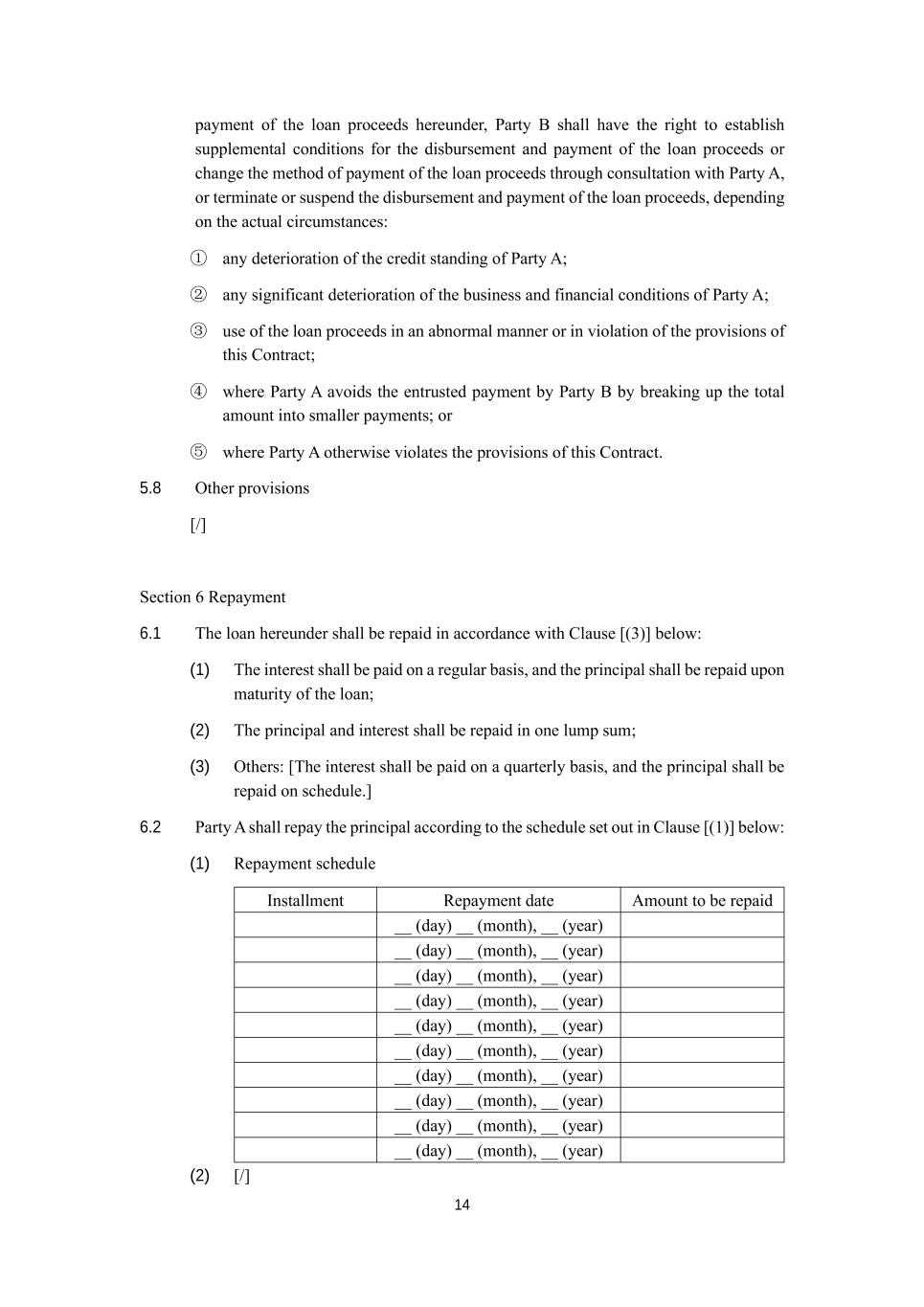14 payment of the loan proceeds hereunder, Party B shall have the right to establish supplemental conditions for the disbursement and payment of the loan proceeds or change the method of payment of the loan proceeds through consultation with Party A, or terminate or suspend the disbursement and payment of the loan proceeds, depending on the actual circumstances: ① any deterioration of the credit standing of Party A; ② any significant deterioration of the business and financial conditions of Party A; ③ use of the loan proceeds in an abnormal manner or in violation of the provisions of this Contract; ④ where Party A avoids the entrusted payment by Party B by breaking up the total amount into smaller payments; or ⑤ where Party A otherwise violates the provisions of this Contract. 5.8 Other provisions [/] Section 6 Repayment 6.1 The loan hereunder shall be repaid in accordance with Clause [(3)] below: (1) The interest shall be paid on a regular basis, and the principal shall be repaid upon maturity of the loan; (2) The principal and interest shall be repaid in one lump sum; (3) Others: [The interest shall be paid on a quarterly basis, and the principal shall be repaid on schedule.] 6.2 Party A shall repay the principal according to the schedule set out in Clause [(1)] below: (1) Repayment schedule Installment Repayment date Amount to be repaid __ (day) __ (month), __ (year) __ (day) __ (month), __ (year) __ (day) __ (month), __ (year) __ (day) __ (month), __ (year) __ (day) __ (month), __ (year) __ (day) __ (month), __ (year) __ (day) __ (month), __ (year) __ (day) __ (month), __ (year) __ (day) __ (month), __ (year) __ (day) __ (month), __ (year) (2) [/]