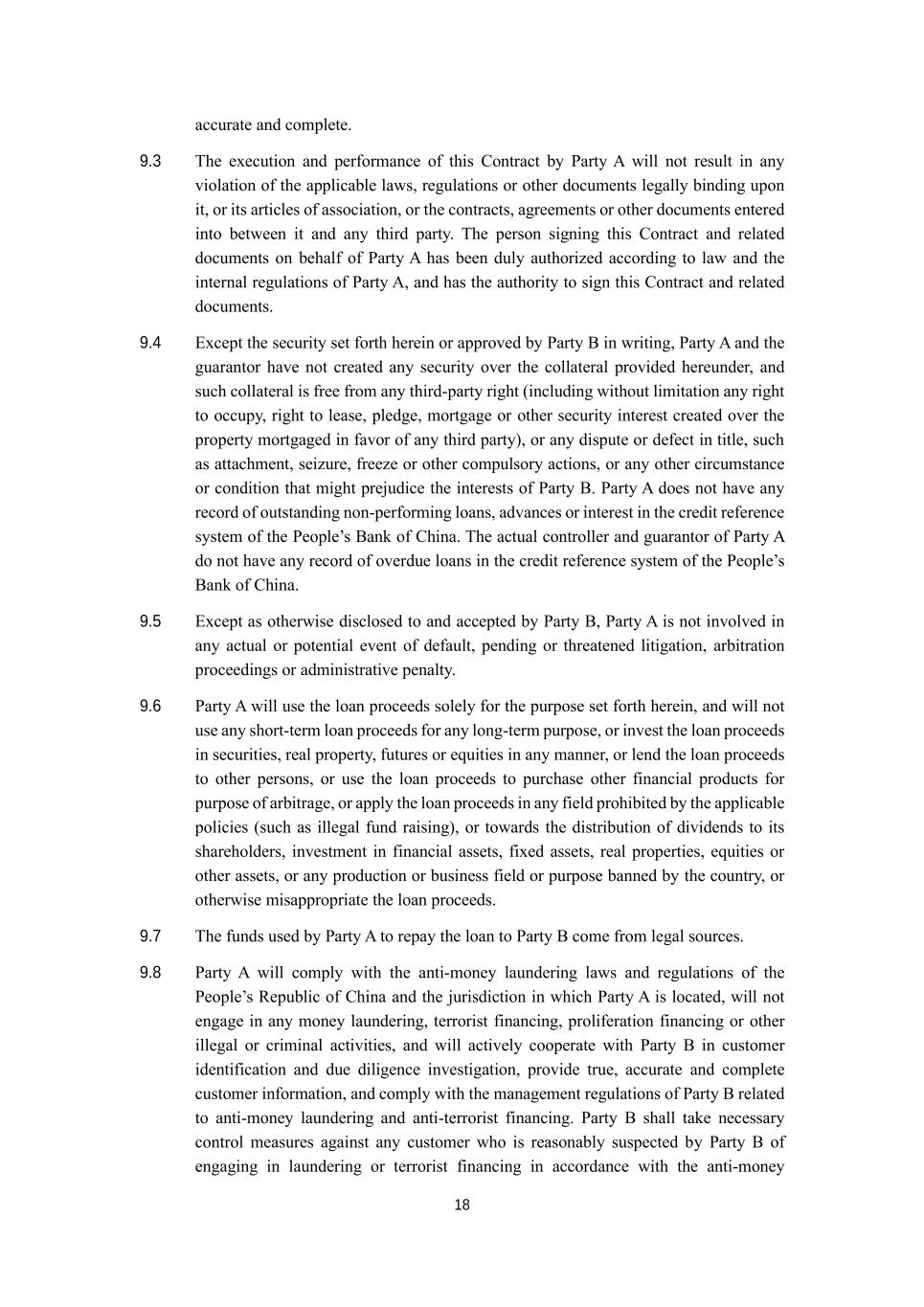 18 accurate and complete. 9.3 The execution and performance of this Contract by Party A will not result in any violation of the applicable laws, regulations or other documents legally binding upon it, or its articles of association, or the contracts, agreements or other documents entered into between it and any third party. The person signing this Contract and related documents on behalf of Party A has been duly authorized according to law and the internal regulations of Party A, and has the authority to sign this Contract and related documents. 9.4 Except the security set forth herein or approved by Party B in writing, Party A and the guarantor have not created any security over the collateral provided hereunder, and such collateral is free from any third-party right (including without limitation any right to occupy, right to lease, pledge, mortgage or other security interest created over the property mortgaged in favor of any third party), or any dispute or defect in title, such as attachment, seizure, freeze or other compulsory actions, or any other circumstance or condition that might prejudice the interests of Party B. Party A does not have any record of outstanding non-performing loans, advances or interest in the credit reference system of the People’s Bank of China. The actual controller and guarantor of Party A do not have any record of overdue loans in the credit reference system of the People’s Bank of China. 9.5 Except as otherwise disclosed to and accepted by Party B, Party A is not involved in any actual or potential event of default, pending or threatened litigation, arbitration proceedings or administrative penalty. 9.6 Party A will use the loan proceeds solely for the purpose set forth herein, and will not use any short-term loan proceeds for any long-term purpose, or invest the loan proceeds in securities, real property, futures or equities in any manner, or lend the loan proceeds to other persons, or use the loan proceeds to purchase other financial products for purpose of arbitrage, or apply the loan proceeds in any field prohibited by the applicable policies (such as illegal fund raising), or towards the distribution of dividends to its shareholders, investment in financial assets, fixed assets, real properties, equities or other assets, or any production or business field or purpose banned by the country, or otherwise misappropriate the loan proceeds. 9.7 The funds used by Party A to repay the loan to Party B come from legal sources. 9.8 Party A will comply with the anti-money laundering laws and regulations of the People’s Republic of China and the jurisdiction in which Party A is located, will not engage in any money laundering, terrorist financing, proliferation financing or other illegal or criminal activities, and will actively cooperate with Party B in customer identification and due diligence investigation, provide true, accurate and complete customer information, and comply with the management regulations of Party B related to anti-money laundering and anti-terrorist financing. Party B shall take necessary control measures against any customer who is reasonably suspected by Party B of engaging in laundering or terrorist financing in accordance with the anti-money