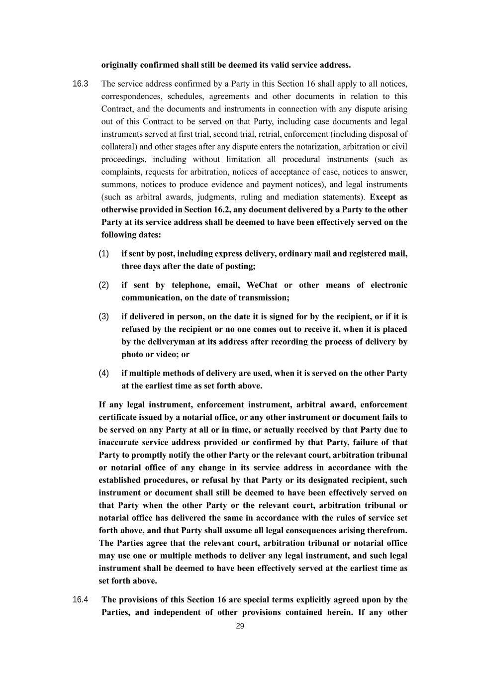 29 originally confirmed shall still be deemed its valid service address. 16.3 The service address confirmed by a Party in this Section 16 shall apply to all notices, correspondences, schedules, agreements and other documents in relation to this Contract, and the documents and instruments in connection with any dispute arising out of this Contract to be served on that Party, including case documents and legal instruments served at first trial, second trial, retrial, enforcement (including disposal of collateral) and other stages after any dispute enters the notarization, arbitration or civil proceedings, including without limitation all procedural instruments (such as complaints, requests for arbitration, notices of acceptance of case, notices to answer, summons, notices to produce evidence and payment notices), and legal instruments (such as arbitral awards, judgments, ruling and mediation statements). Except as otherwise provided in Section 16.2, any document delivered by a Party to the other Party at its service address shall be deemed to have been effectively served on the following dates: (1) if sent by post, including express delivery, ordinary mail and registered mail, three days after the date of posting; (2) if sent by telephone, email, WeChat or other means of electronic communication, on the date of transmission; (3) if delivered in person, on the date it is signed for by the recipient, or if it is refused by the recipient or no one comes out to receive it, when it is placed by the deliveryman at its address after recording the process of delivery by photo or video; or (4) if multiple methods of delivery are used, when it is served on the other Party at the earliest time as set forth above. If any legal instrument, enforcement instrument, arbitral award, enforcement certificate issued by a notarial office, or any other instrument or document fails to be served on any Party at all or in time, or actually received by that Party due to inaccurate service address provided or confirmed by that Party, failure of that Party to promptly notify the other Party or the relevant court, arbitration tribunal or notarial office of any change in its service address in accordance with the established procedures, or refusal by that Party or its designated recipient, such instrument or document shall still be deemed to have been effectively served on that Party when the other Party or the relevant court, arbitration tribunal or notarial office has delivered the same in accordance with the rules of service set forth above, and that Party shall assume all legal consequences arising therefrom. The Parties agree that the relevant court, arbitration tribunal or notarial office may use one or multiple methods to deliver any legal instrument, and such legal instrument shall be deemed to have been effectively served at the earliest time as set forth above. 16.4 The provisions of this Section 16 are special terms explicitly agreed upon by the Parties, and independent of other provisions contained herein. If any other