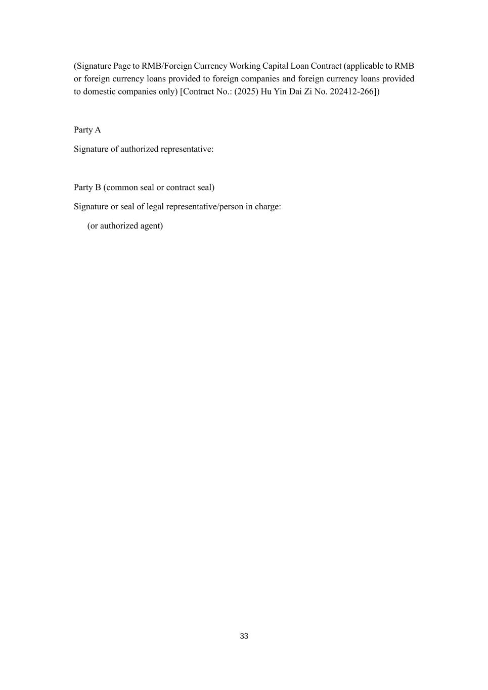 33 (Signature Page to RMB/Foreign Currency Working Capital Loan Contract (applicable to RMB or foreign currency loans provided to foreign companies and foreign currency loans provided to domestic companies only) [Contract No.: (2025) Hu Yin Dai Zi No. 202412-266]) Party A Signature of authorized representative: Party B (common seal or contract seal) Signature or seal of legal representative/person in charge: (or authorized agent)