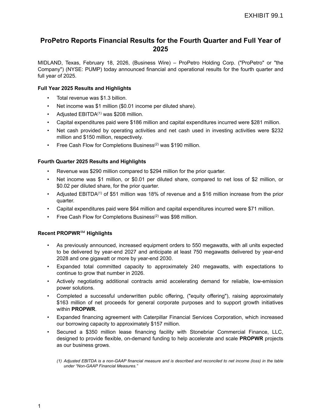 ProPetro Reports Financial Results for the Fourth Quarter and Full Year of 2025 MIDLAND, Texas, February 18, 2026, (Business Wire) – ProPetro Holding Corp. ("ProPetro" or "the Company") (NYSE: PUMP) today announced financial and operational results for the fourth quarter and full year of 2025. Full Year 2025 Results and Highlights • Total revenue was $1.3 billion. • Net income was $1 million ($0.01 income per diluted share). • Adjusted EBITDA(1) was $208 million. • Capital expenditures paid were $186 million and capital expenditures incurred were $281 million. • Net cash provided by operating activities and net cash used in investing activities were $232 million and $150 million, respectively. • Free Cash Flow for Completions Business(2) was $190 million. Fourth Quarter 2025 Results and Highlights • Revenue was $290 million compared to $294 million for the prior quarter. • Net income was $1 million, or $0.01 per diluted share, compared to net loss of $2 million, or $0.02 per diluted share, for the prior quarter. • Adjusted EBITDA(1) of $51 million was 18% of revenue and a $16 million increase from the prior quarter. • Capital expenditures paid were $64 million and capital expenditures incurred were $71 million. • Free Cash Flow for Completions Business(2) was $98 million. Recent PROPWR℠ Highlights • As previously announced, increased equipment orders to 550 megawatts, with all units expected to be delivered by year-end 2027 and anticipate at least 750 megawatts delivered by year-end 2028 and one gigawatt or more by year-end 2030. • Expanded total committed capacity to approximately 240 megawatts, with expectations to continue to grow that number in 2026. • Actively negotiating additional contracts amid accelerating demand for reliable, low-emission power solutions. • Completed a successful underwritten public offering, ("equity offering"), raising approximately $163 million of net proceeds for general corporate purposes and to support growth initiatives within PROPWR. • Expanded financing agreement with Caterpillar Financial Services Corporation, which increased our borrowing capacity to approximately $157 million. • Secured a $350 million lease financing facility with Stonebriar Commercial Finance, LLC, designed to provide flexible, on-demand funding to help accelerate and scale PROPWR projects as our business grows. (1) Adjusted EBITDA is a non-GAAP financial measure and is described and reconciled to net income (loss) in the table under “Non-GAAP Financial Measures.” 1